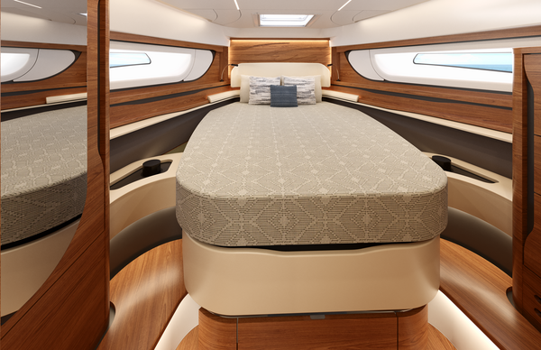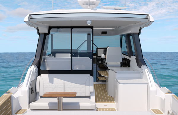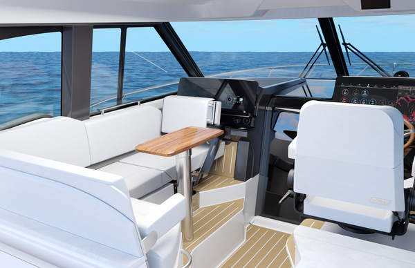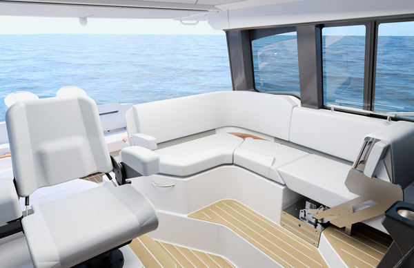 Aft, the cockpit offers a customizable experience to suit your lifestyle, with the choice of Buffet Lounge or Adventure modules. An aft-facing cockpit seat with integrated storage complements either configuration, enhancing both comfort and functionality.