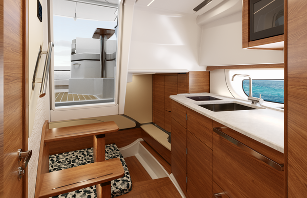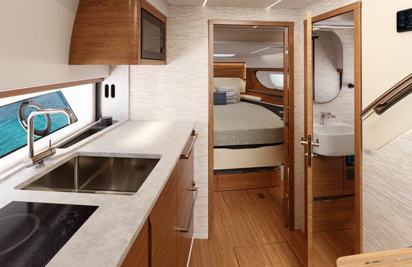 Enhances comfort and functionality while complementing either cockpit configuration.Below-Deck Galley Design