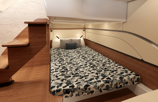 Below deck, the galley is thoughtfully positioned to maximize the open, social feel above. Equipped with a sink, microwave, cooktop, and premium finishes, it’s designed to support entertaining with ease. Two well-appointed staterooms provide comfortable accommodations for extended cruising, while a three-zone head completes the layout with thoughtful convenience.