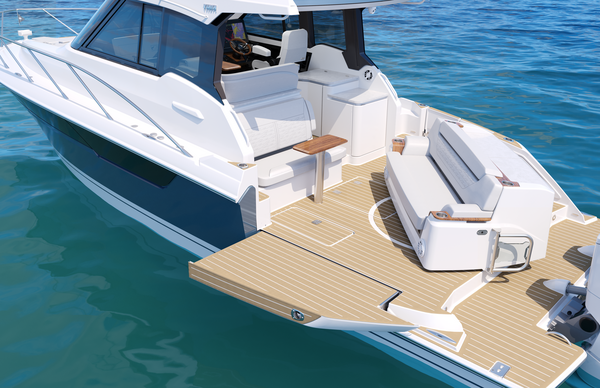 Rotating helm seat and convertible companion seat create an inviting L-shaped lounge for entertaining underway or at rest.Customizable Aft Cockpit Experience