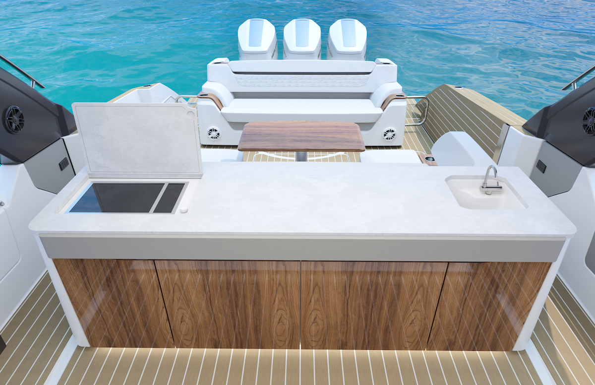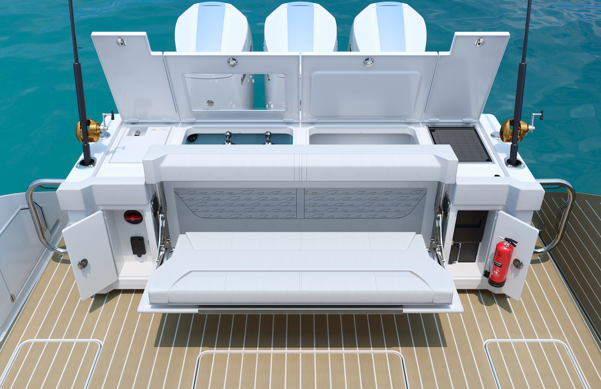 Fold-Down Portside Terrace – Expands cockpit space and creates a beach-club feel at anchor.