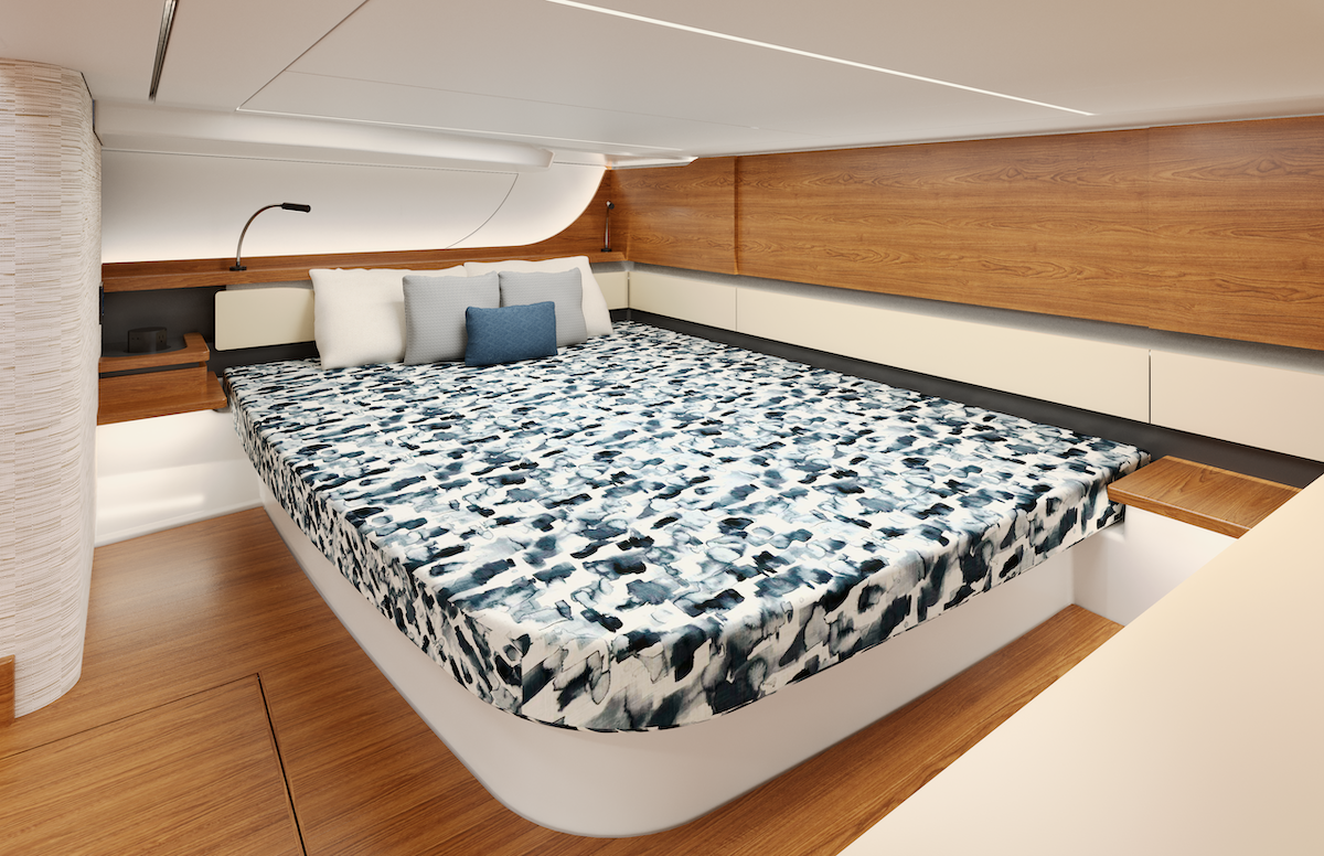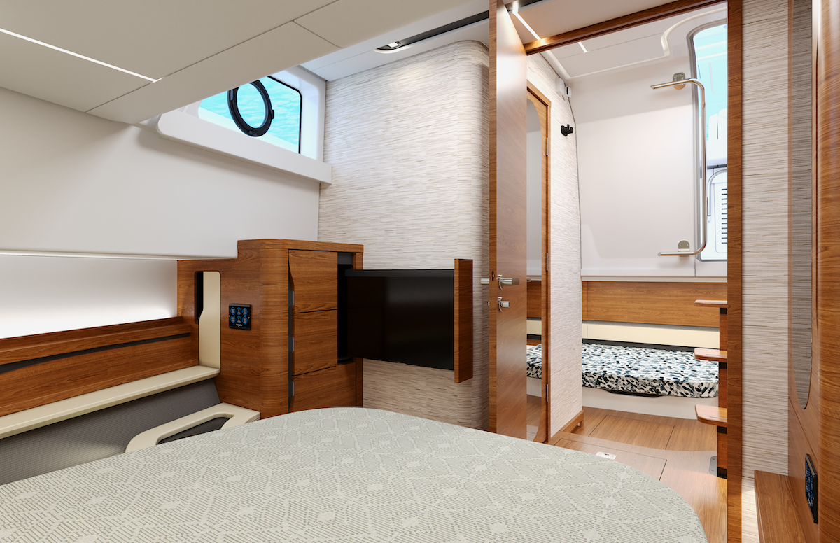 Below deck, a welcoming retreat features a forward berth, private mid-cabin stateroom, spacious head, and ample storage. A well-appointed mid-cockpit galley, complemented by additional prep space and pantry storage below, makes onboard entertaining effortless.