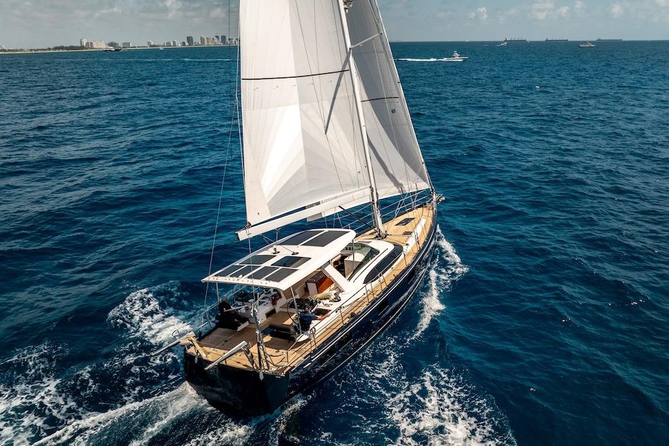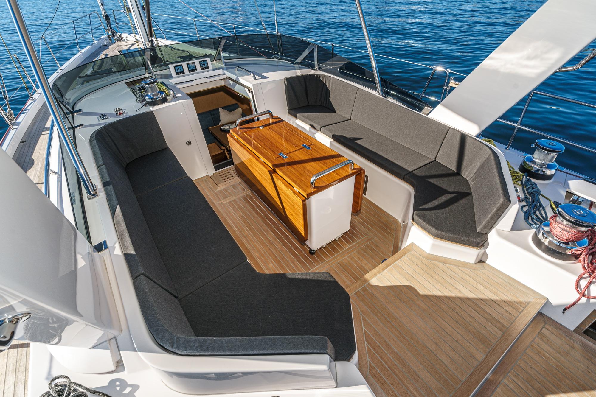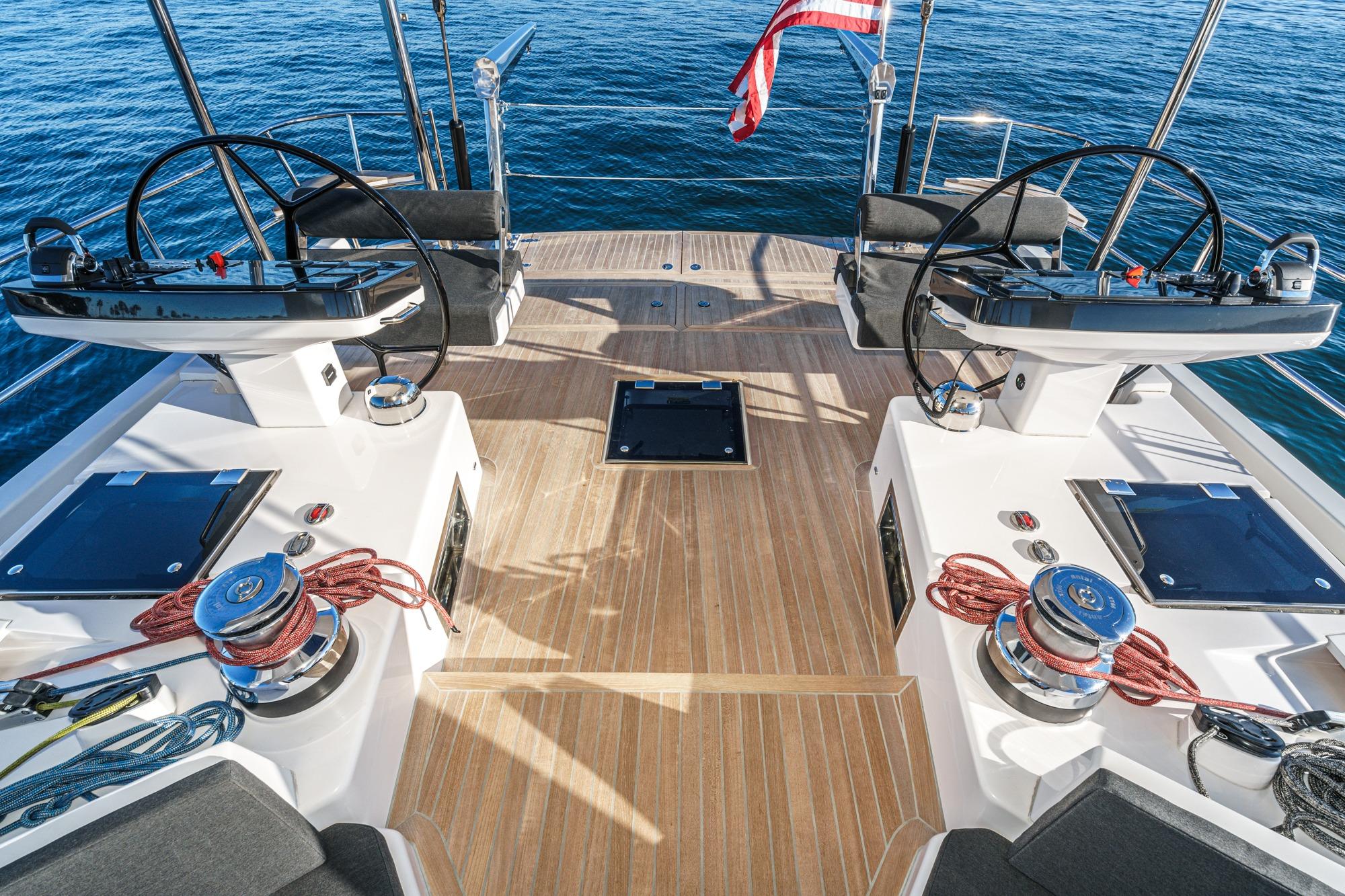 Selected by Cruising World Magazine at the "Boat of the Year", the Hylas H57 brings a fresh look and game changing lifestyle enhancements that redefine life on board. What hasn't changed is the build quality and capability you would expect from a Hylas built sailboat. Uncluttered decks for ease of movement. An integrated hardtop that enhances the yacht’s profile also provides all-weather protection and an opportunity for a full helm enclosure. The hardtop doubles as a perfect platform for solar power. The solent rig and self tacking jib offer fingertip furling and minimal line handling from the spacious cockpit. A fixed spray shield that takes the edge off upwind legs and is sturdy enough to deflect any green water coming aboard. The integrated deck wings and automated swim platform more than double the social space aft of the already expansive cockpit. Apres sail on the H57 redefines what socializing, grilling out and sundowners can look like.