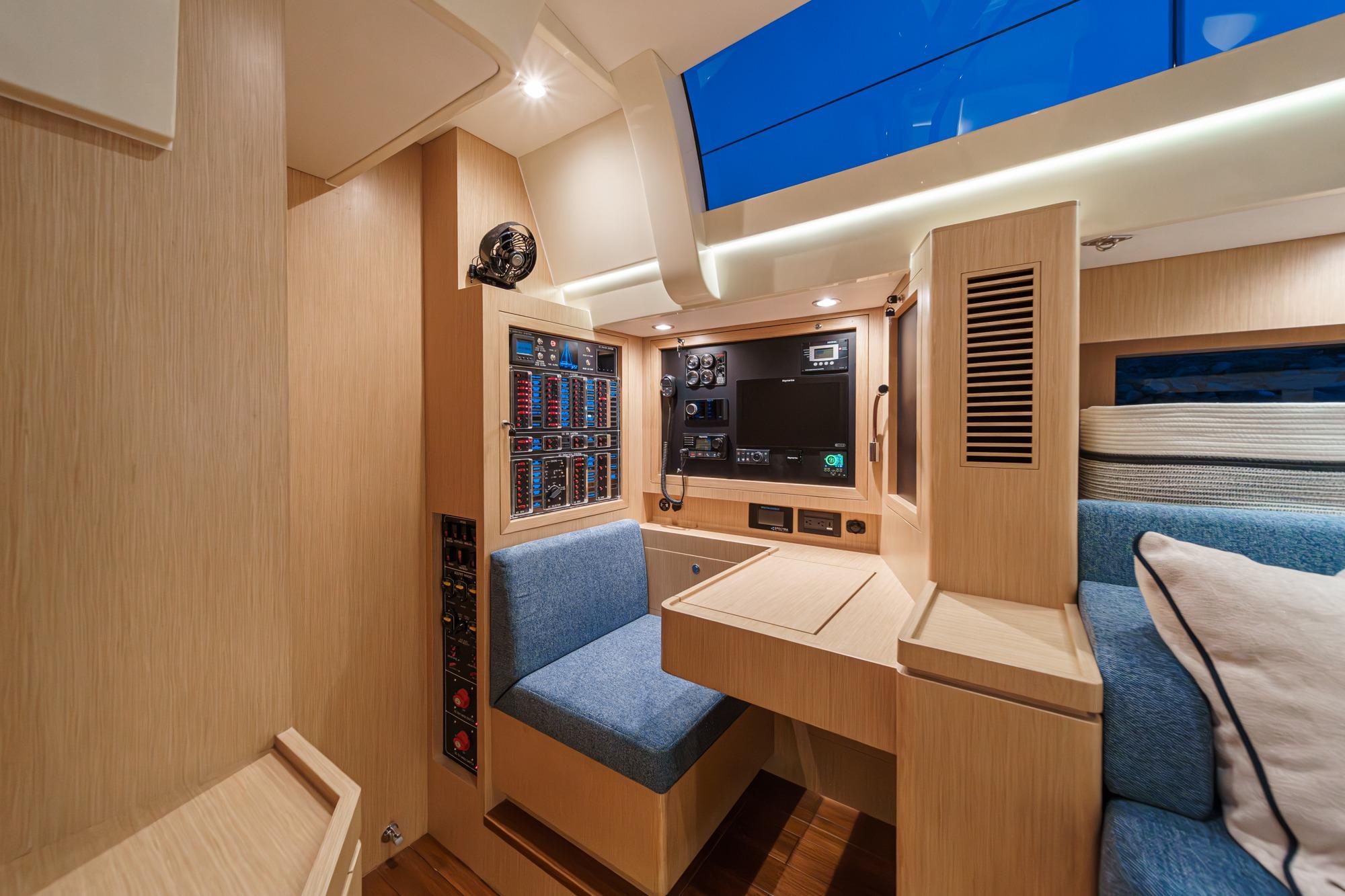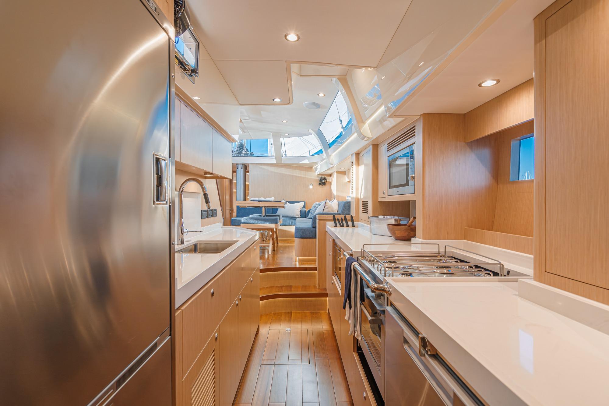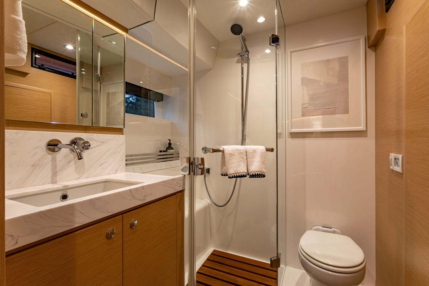The master stateroom is aft offering the most comfort underway in addition to the space and versatility that allows for an ensuite bath with separate shower stall, plenty of storage space, settees, work stations and AV systems. The galley is large enough to accommodate every appliance and the forward guest quarters would be the envy of any host wanting to bring comfort and luxury to friends and family.