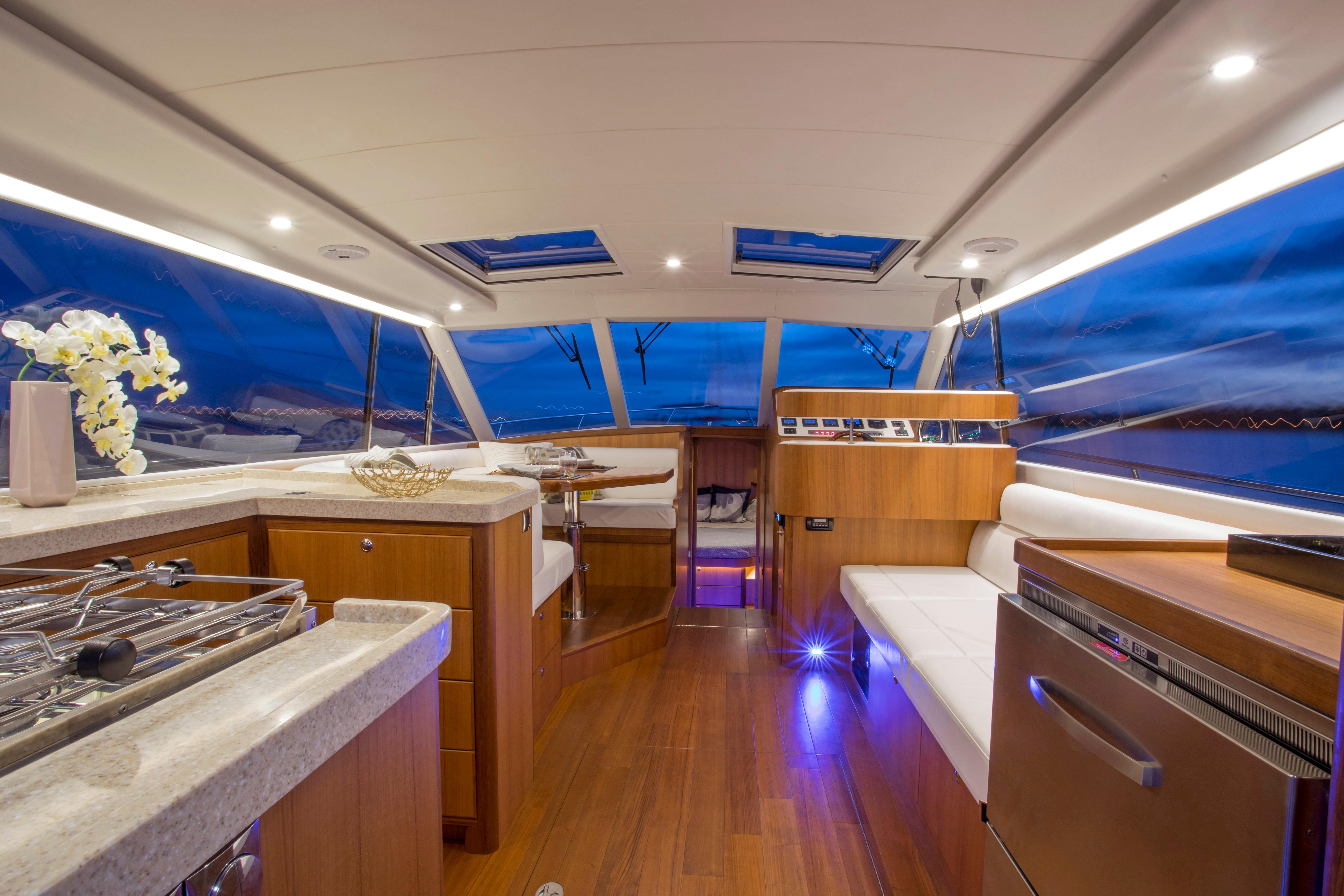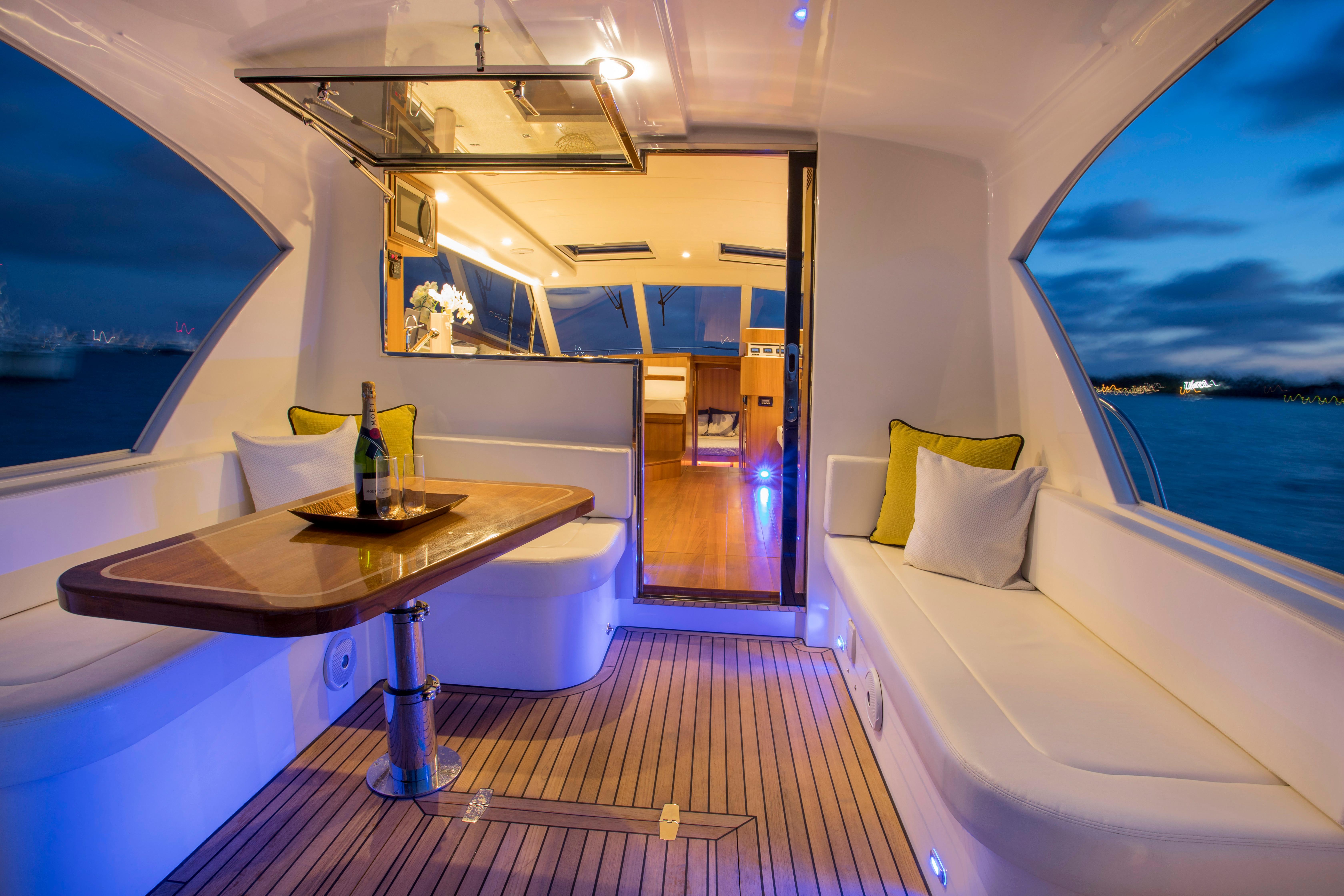 - Salon and cockpit tables providing options for dining or lounging indoors or out