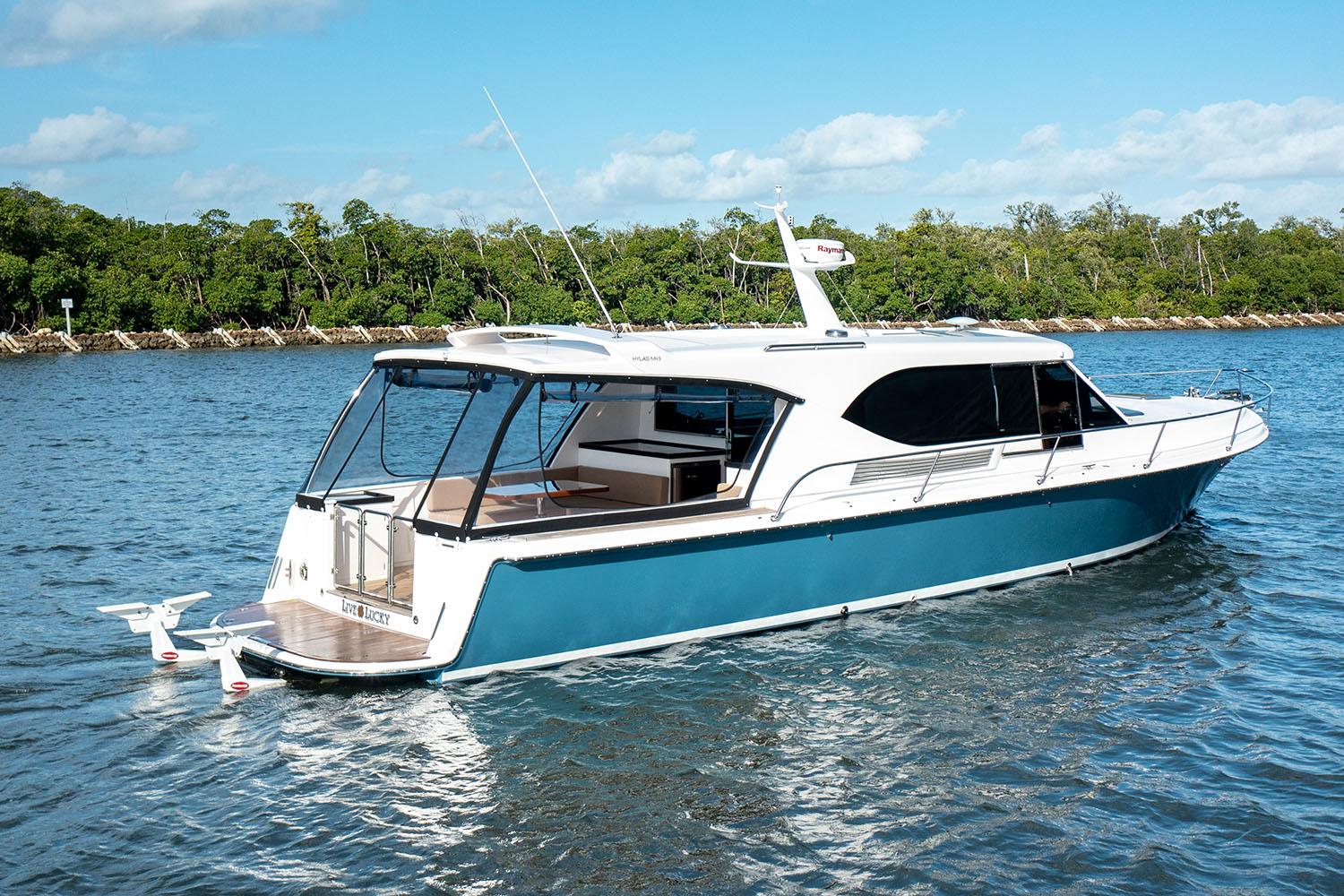 Down-east styling with a well proven hull that extends your cruising range to include open water passages. Perfect for east coast cruising that should include the Bahamas. The Hylas M series powerboats are offered in three configurations: the M44, the M47 (w/ diesel outboards, and the M49. Spacious, fuel efficient, plenty of power and exceptional craftsmanship are what you will find with the new Hylas M49 power yacht. One level of entertaining from the helm station to the swim platform. Grill, day heads, cockpit refrigeration, sun lounger, galley aft, dinette and helm station can all open up to form a stunning bright and inclusive environment. This new Hylas power yacht reflects the finest handcrafted quality and tradition that boat owners have come to expect from Hylas Yachts.