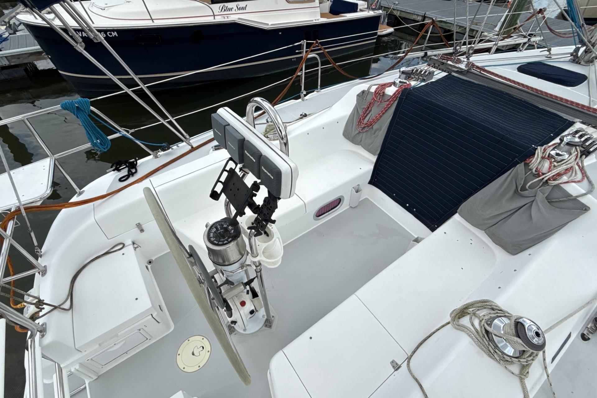 The Catalina 320 is an exciting design that successfully combines the best modern features and construction with Catalina's hallmark comfort and value. Based on a high-performance and high-volume computer-optimized hull design, the 320 is light on the helm and tracks well under sail or power. Motion and heeling are gentle and predictable. The 320 performs well in a variety of conditions, with either the available wing or fin keels. Racing skippers will enjoy the turn of speed and cruisers will appreciate the additional distance covered in a day's passage. Carrying the deck beam well aft created space for an exceptionally large cockpit. The wide coamings and ergonomically correct seats and backs are important features, considering the cockpit is where we all spend the most time when aboard. The weather decks are wide with molded-in non-skid and bulwarks, giving easy, sure access to the foredeck and standard below deck electric anchor windlass. Other important quality features of the deck include the stout aluminum framed opening deck hatches and ball bearing mainsheet traveler system. The rigging and spar systems are engineered for performance and durability. The fore and aft lowers with intermediate and upper shrouds make the rig very secure and easy to keep in tune. A rigid adjustable boom vang is standard. The unique interior is beautifully finished in a rich combination of teak, ash and maple hardwoods, complementing the beige textured fiberglass overhead and full hull liner. Attention to details like the custom molded galley counters with integral backsplashes, three separate lighting circuits in the main cabin, removable panels in the forward bulkhead, and a cedar paneled hanging locker set the 320 apart from the ordinary. The one-piece, integral molded fiberglass subsole grid system is rigid, strong and requires no maintenance.