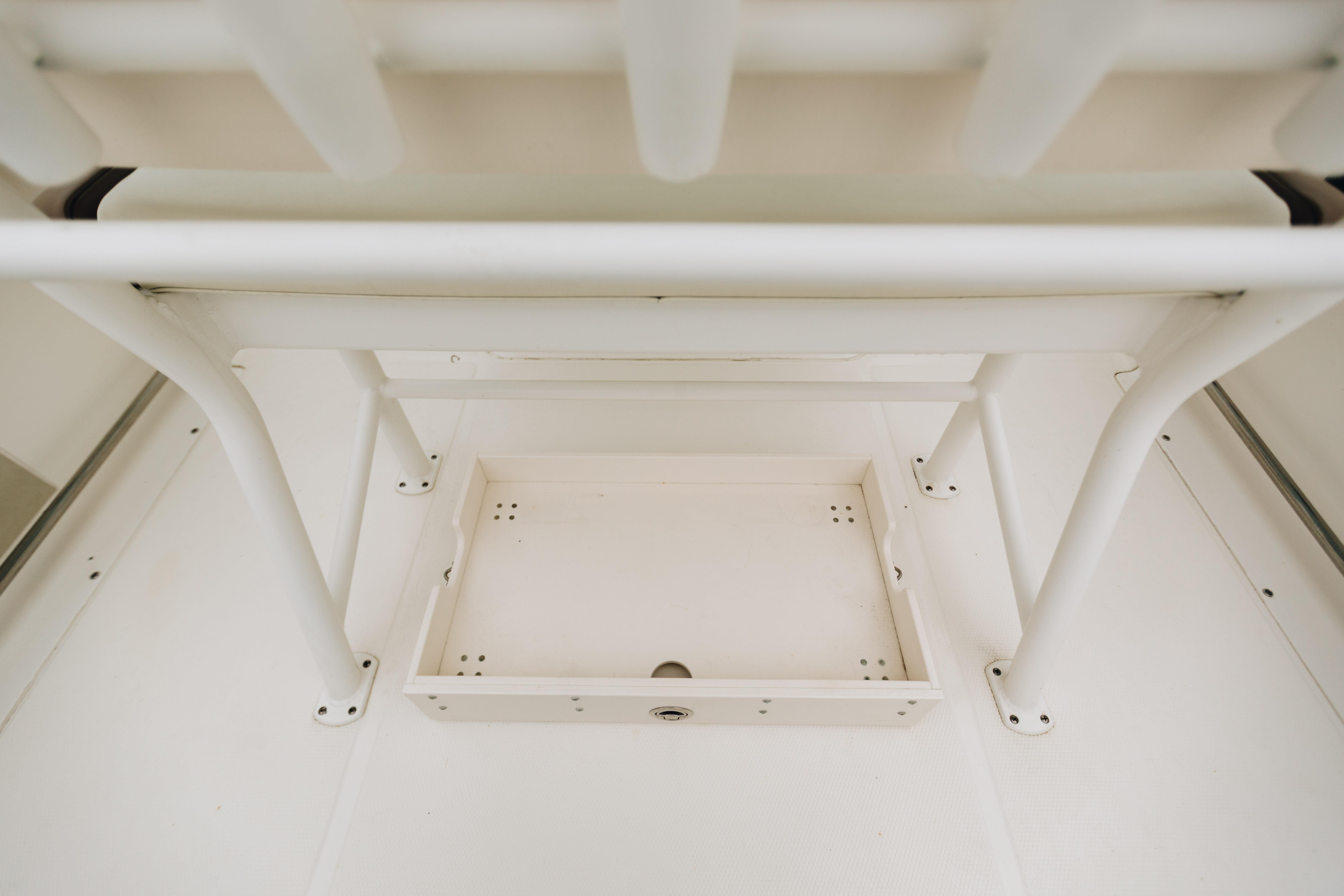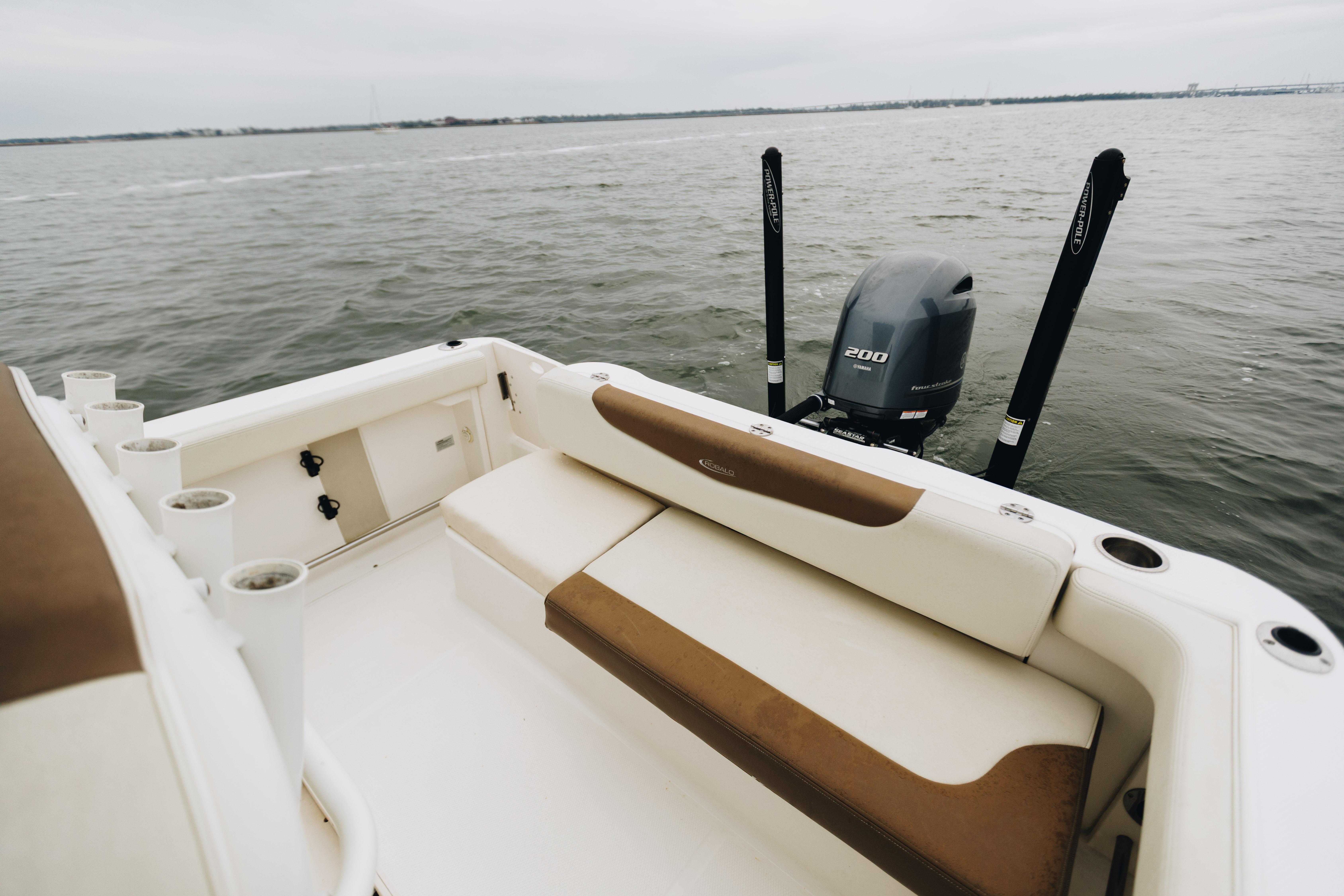 Inside the console is a lockable head compartment with storage, while the helm provides clean space for electronics, comfortable seating, and an ergonomic layout. The cockpit flows seamlessly to the transom gate for easy boarding or water access.