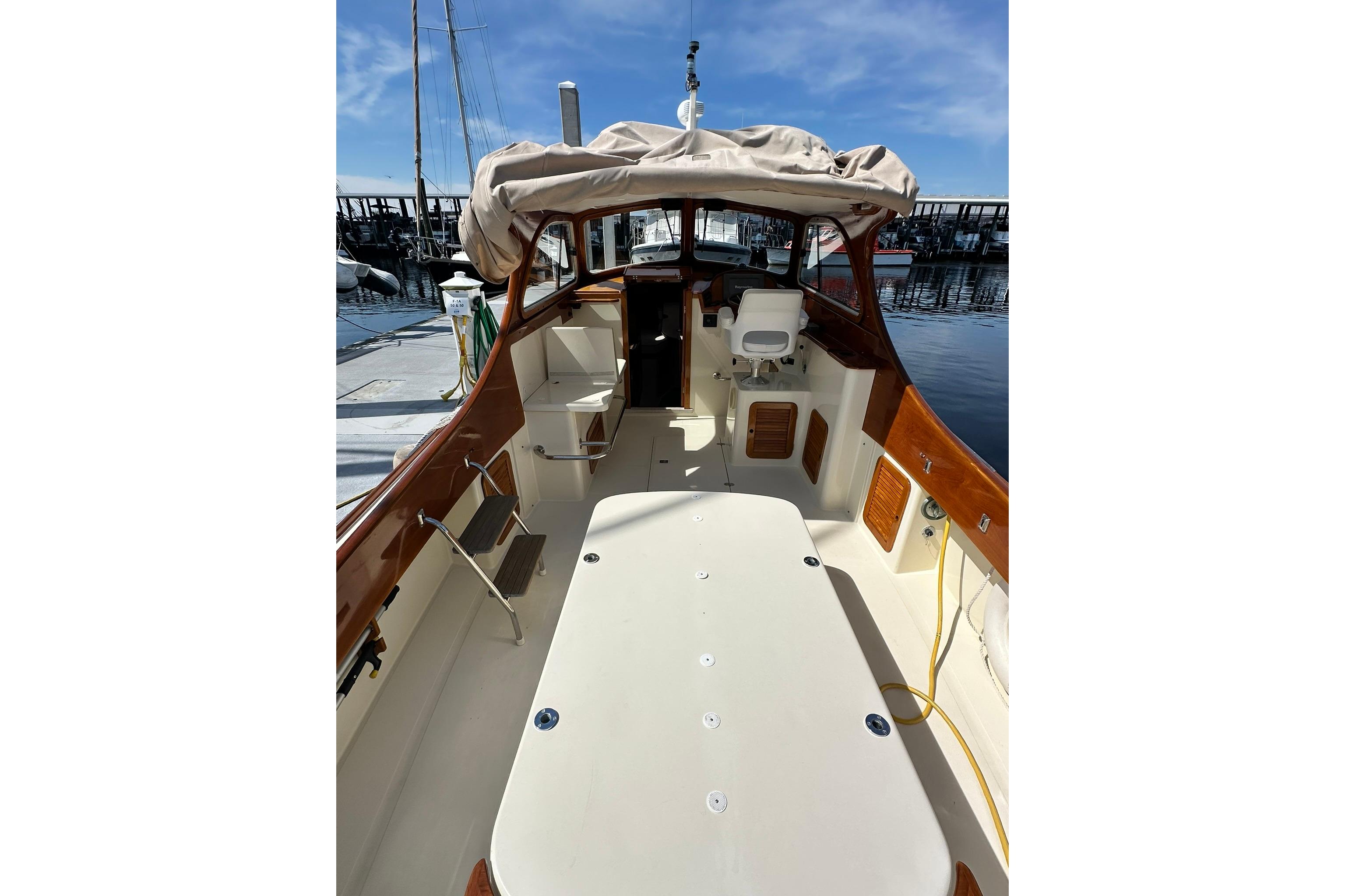 - Interior:The interior is finished in satin varnished cherry and includes a teak and holly cabin sole. The boat comfortably sleeps two below and offers ample space in the pilothouse/cockpit for guests.