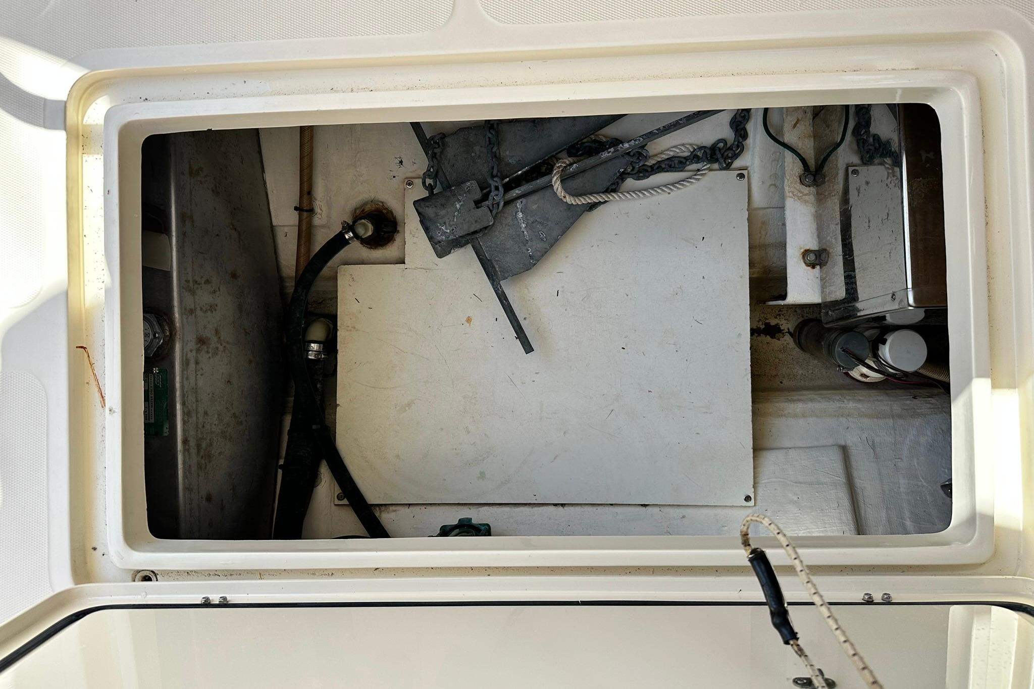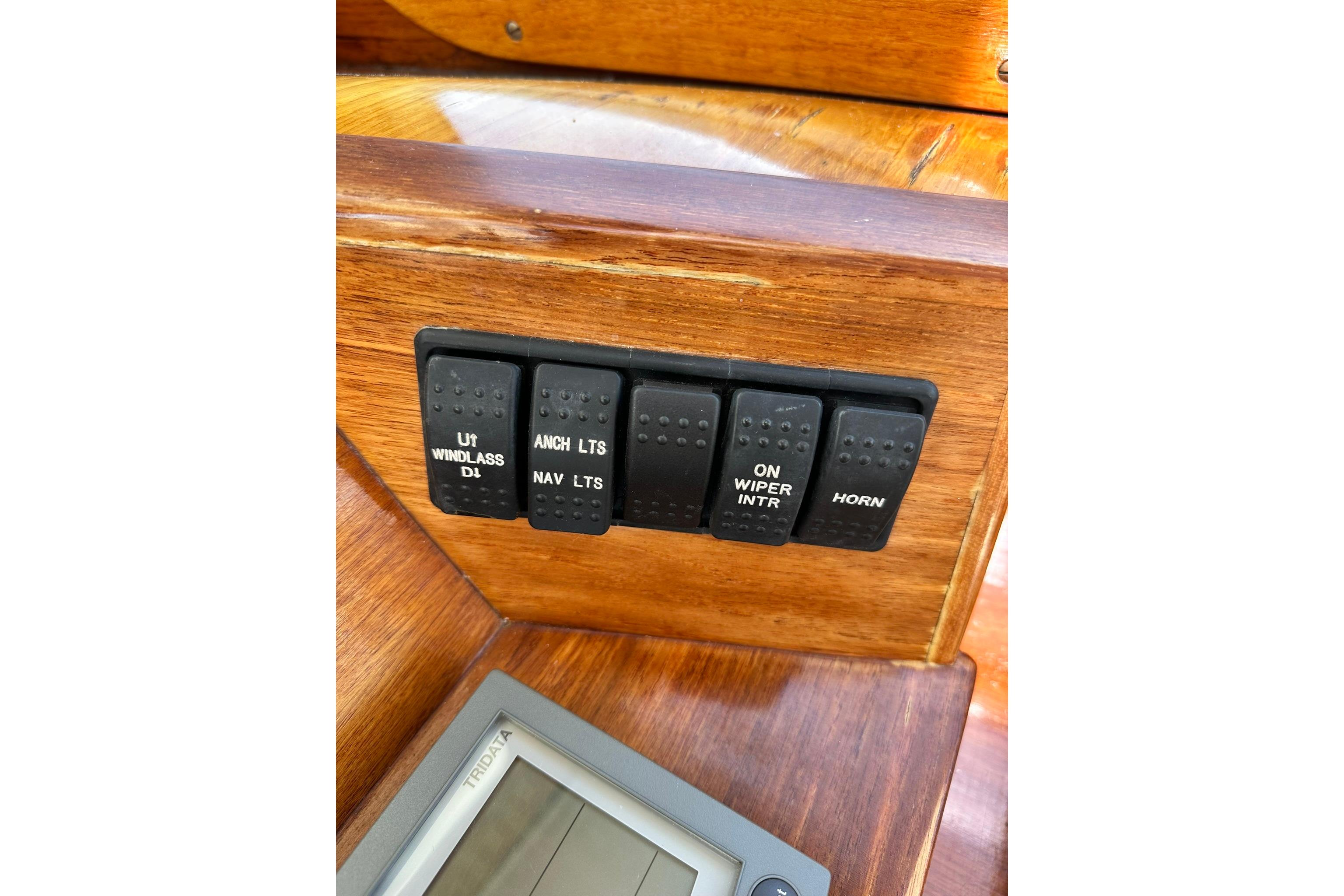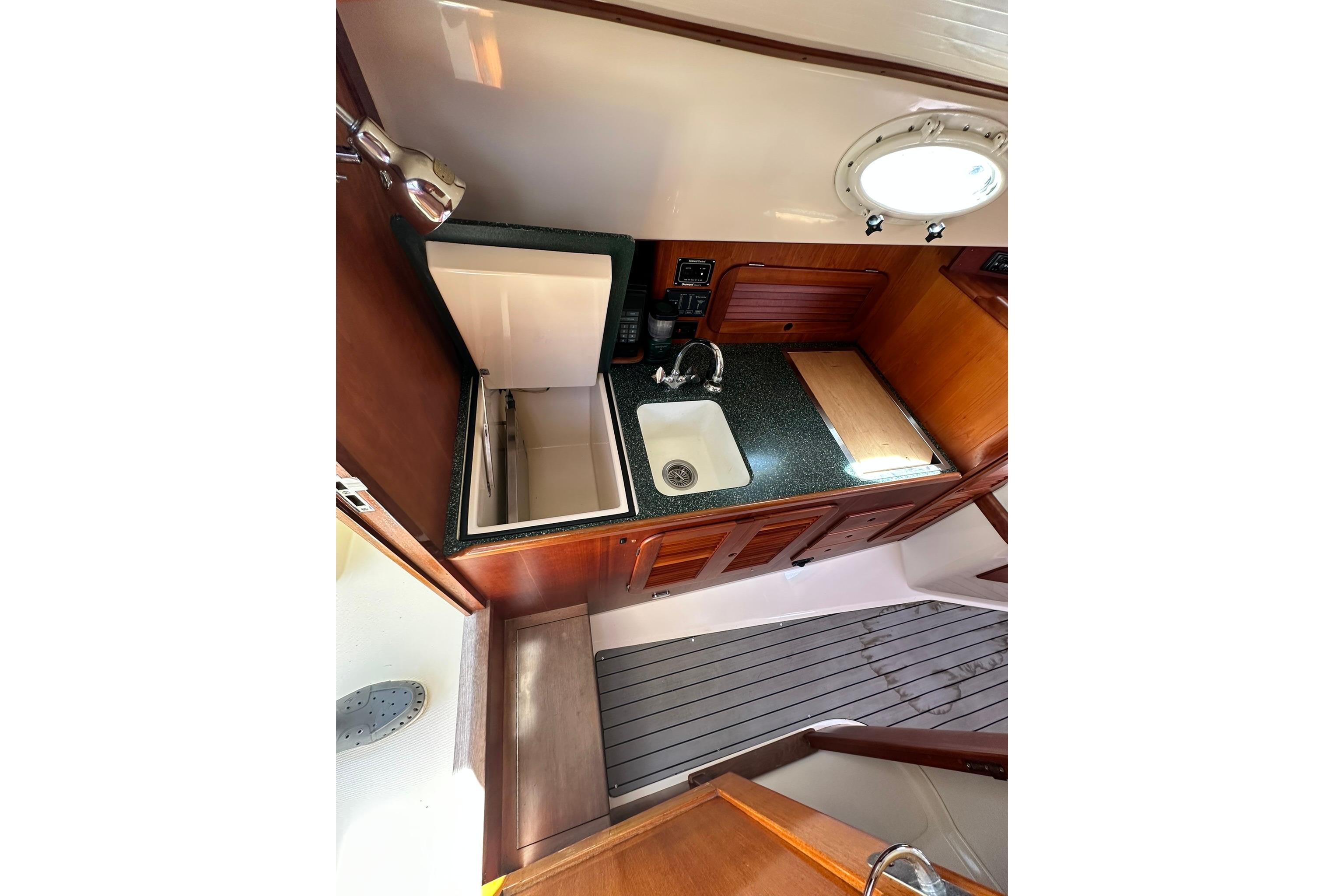 - Notable Features:A galley with a two-burner stove and refrigerator, a private head, and an Accu-point heater are among the interior amenities. Exterior features include varnished teak toe rails, handrails, and a custom Hinckley varnished teak bowsprit.