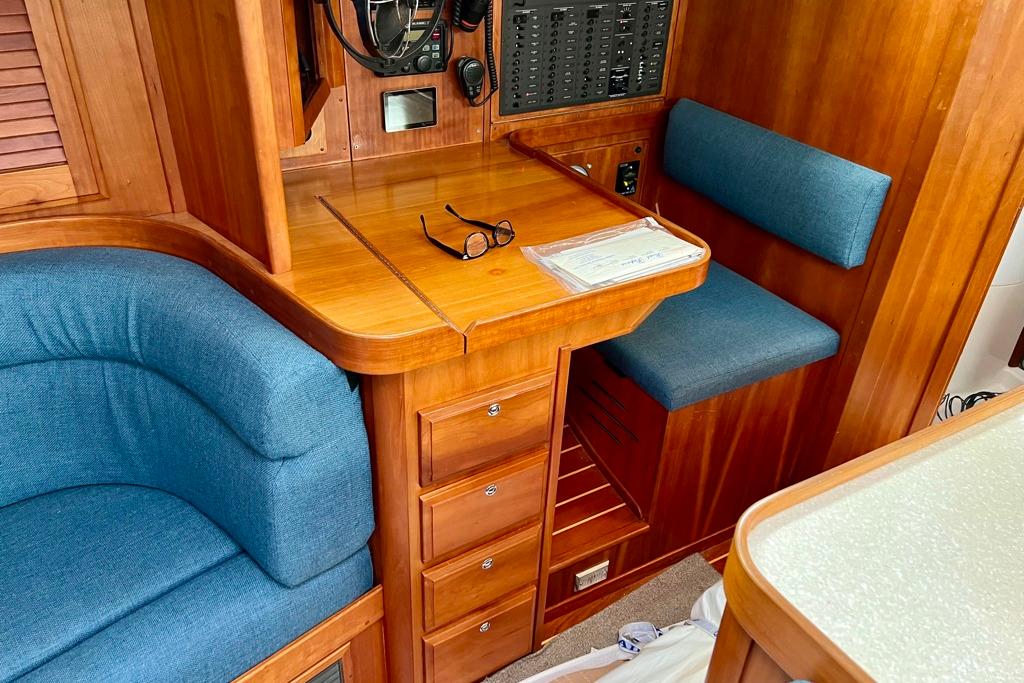 The Sabre 402 with her contemporary, wider beam has an abundance of interior volume. The main salon is impressive and takes full advantage of the 13’4” beam. Comfortable settees are found to port and starboard, with the port side convertible to a double berth. An elegant yacht quality table, which will comfortably seat six, is located on the centerline. Aft and to starboard is the forward facing navigator's table, which has all of the space required for a “home office”.