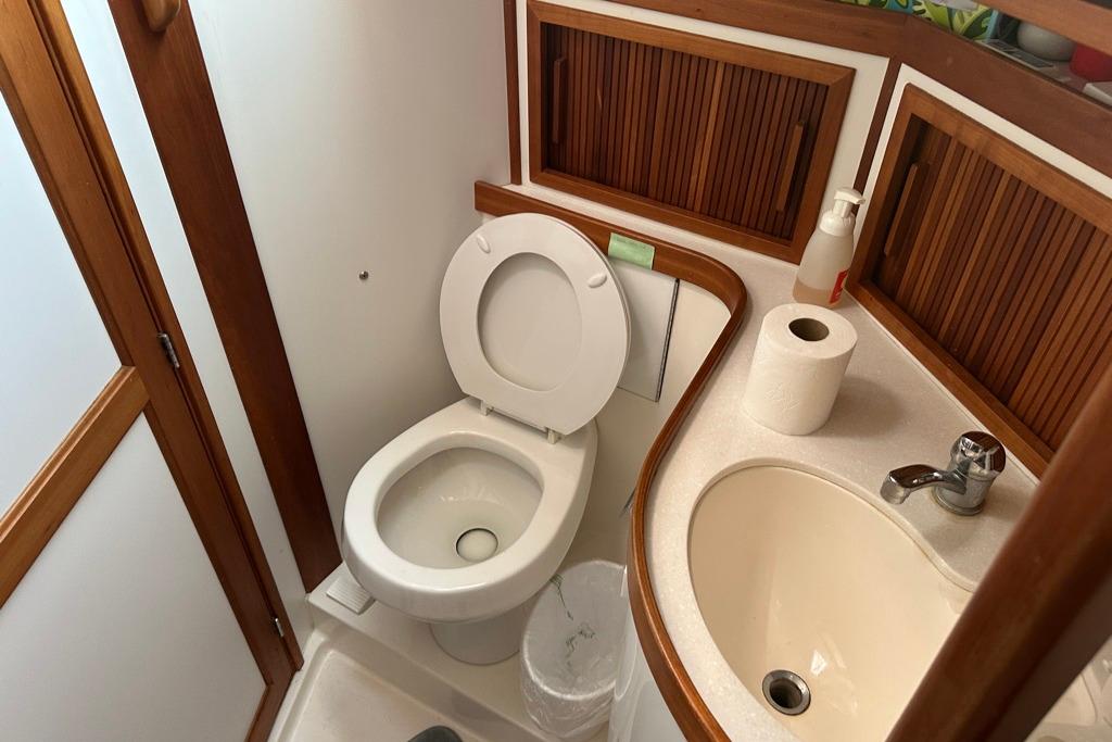 The head is aft of the nav station. Molded in fiberglass, this easily maintained unit incorporates a marine head, a sink recessed in the countertop, and a separate shower stall with teak seat. This compartment has a door providing access to the aft cabin.