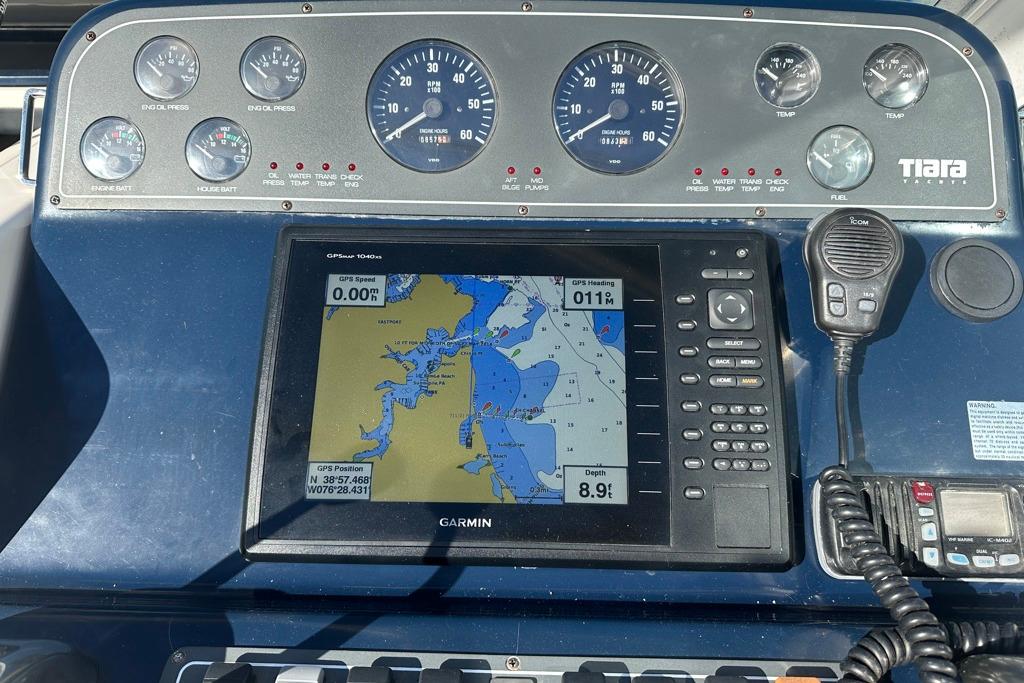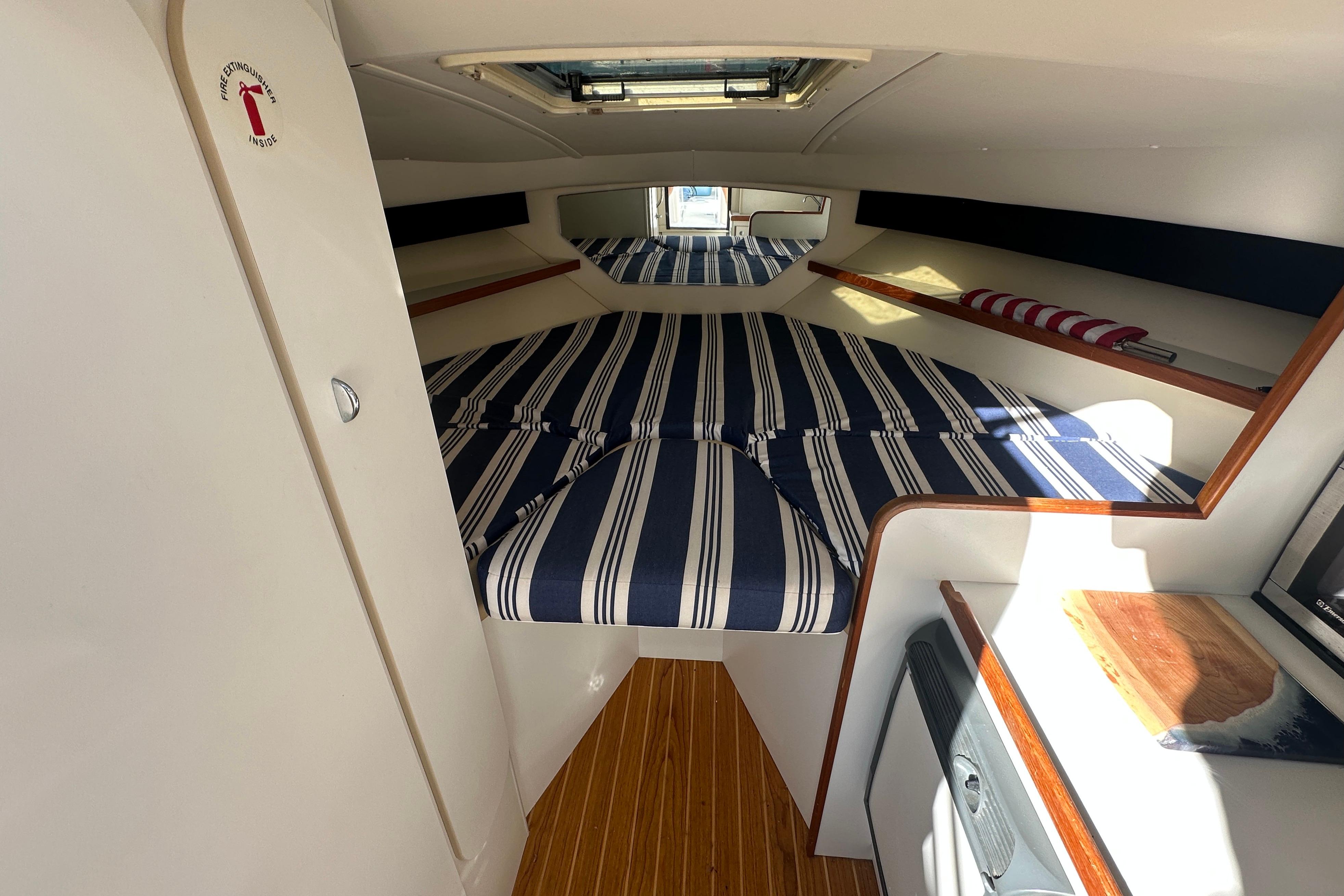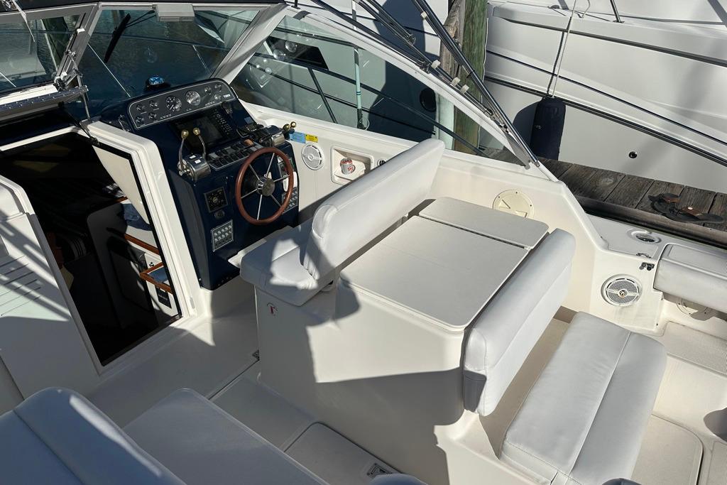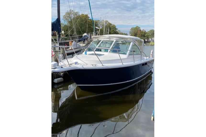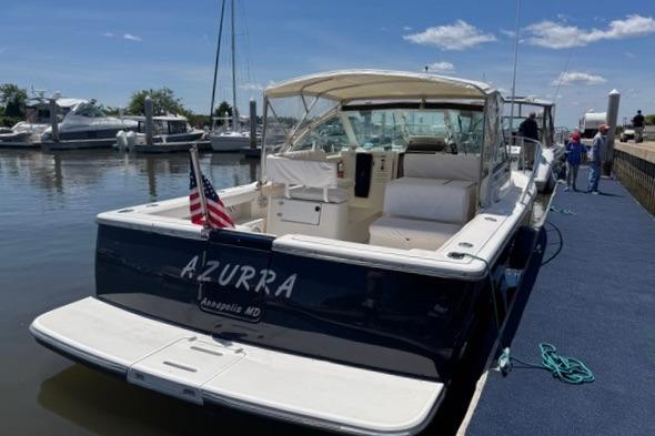 Azzura is a lovingly maintained Tiara 2900 Coronet, with low hours on her Crusader 5.7 MPIs. Designed and developed as an entry model into the Tiara Yachts product family, the Tiara 2900 Coronet offers great versatility, unique styling, and an expansive list of features and equipment. Most visible among the exterior design features are the curved reverse transom, with centerline cockpit entry, and the fully integrated 24-inch swim platform, with built-in ladder. The cockpit has standard seating for 6 - 8, and optional transom lounges increase seating to 10 -12. The overnight sleeper cabin is accessed thru an acrylic bifold companionway door, and features a large 6 foot, 4 inch V-berth, mini galley with microwave, sink and storage, private head with vanity, and hanging locker. An optional refrigerator, and electric toilet is also available. Being a Harbour Edition, Azzura has a higher level of trim and detailing, all in excellent condition.