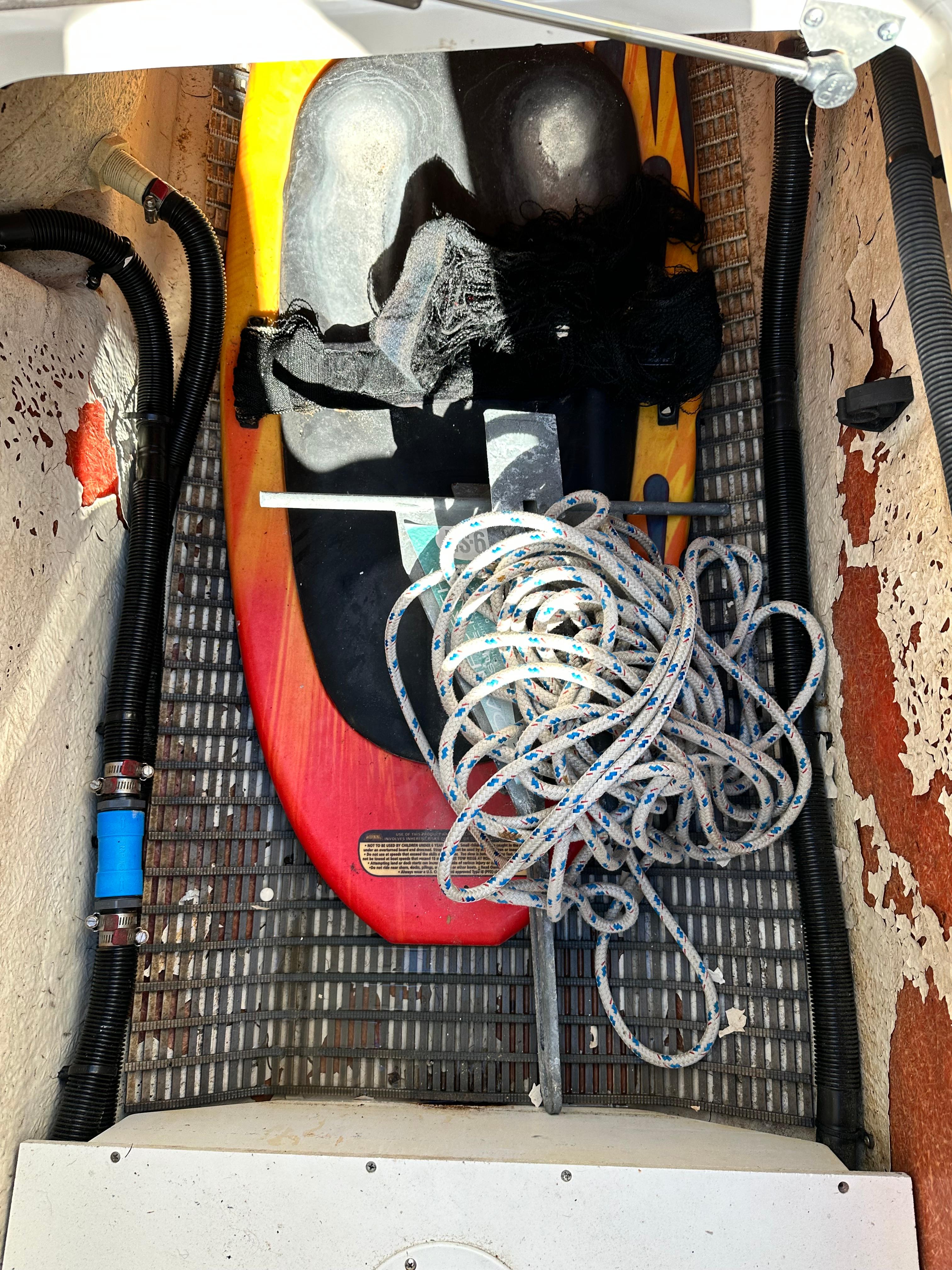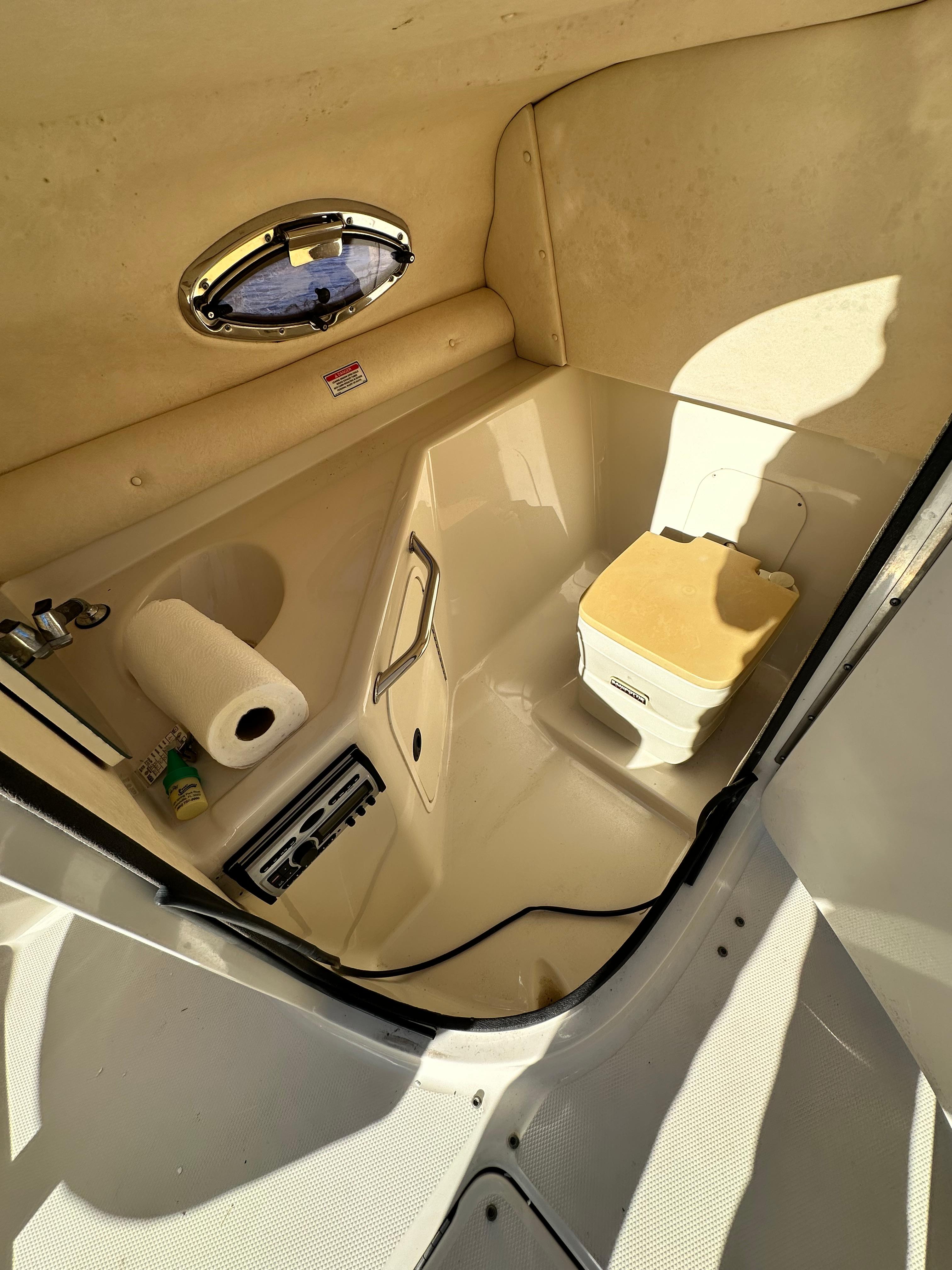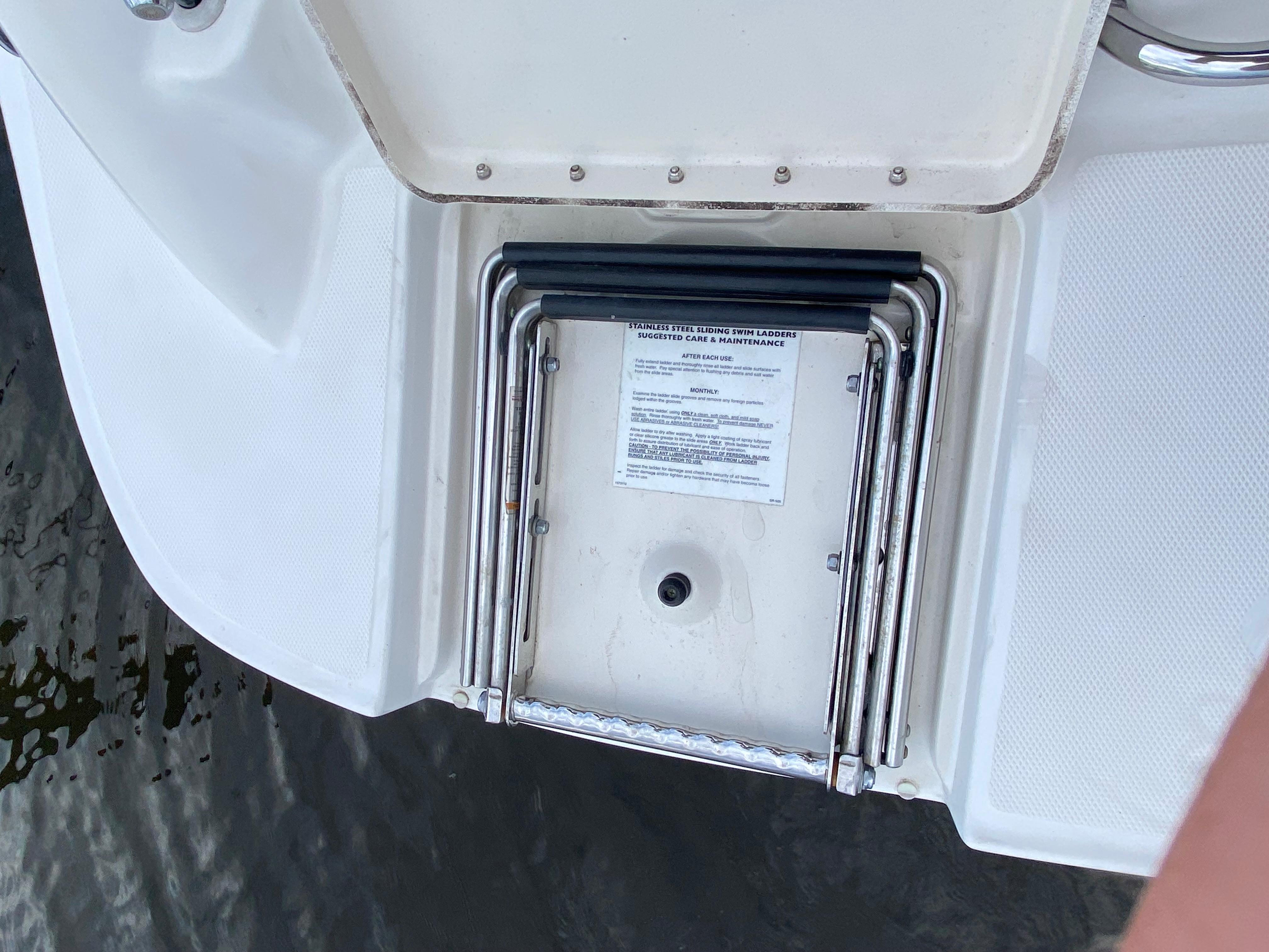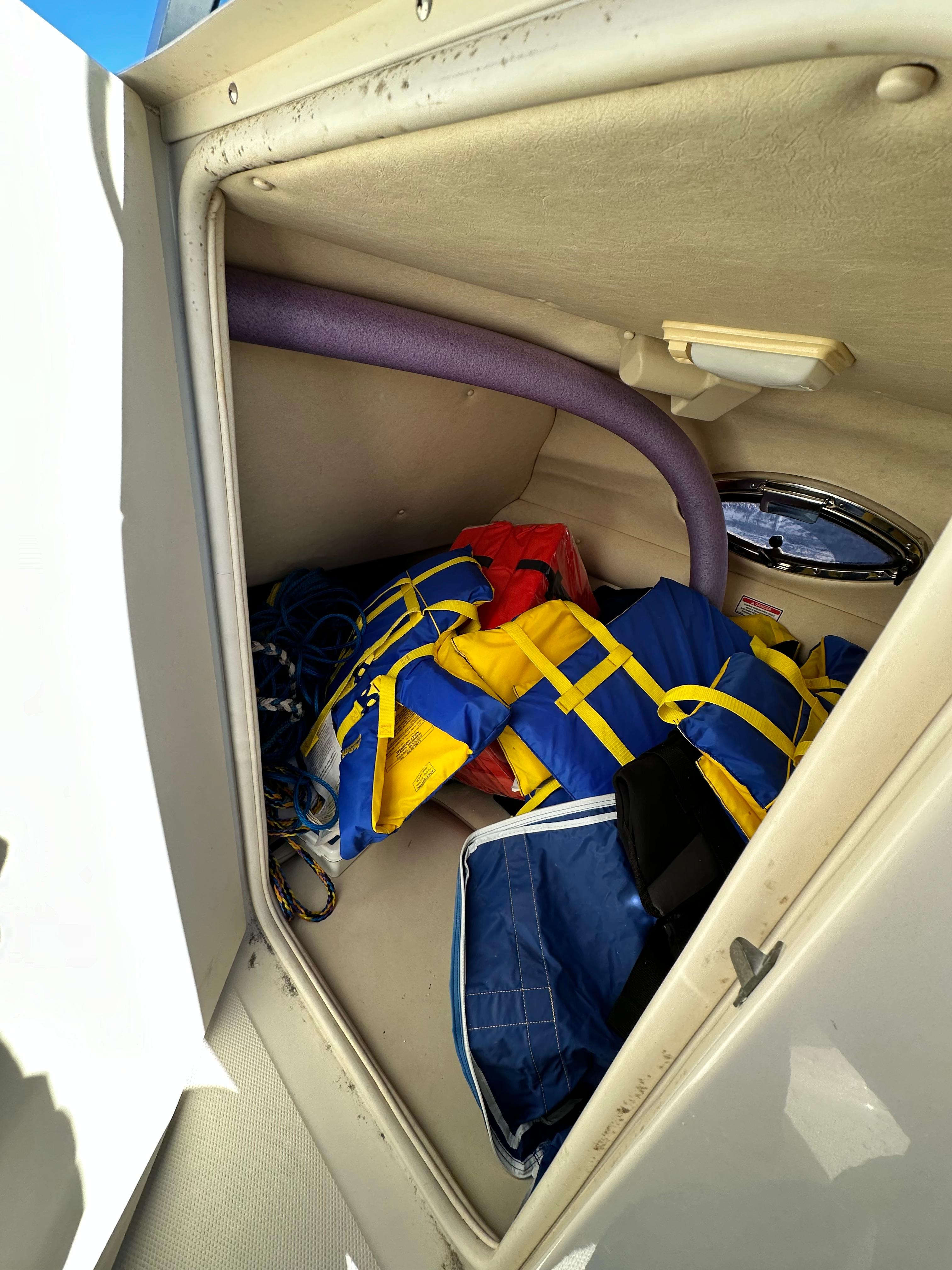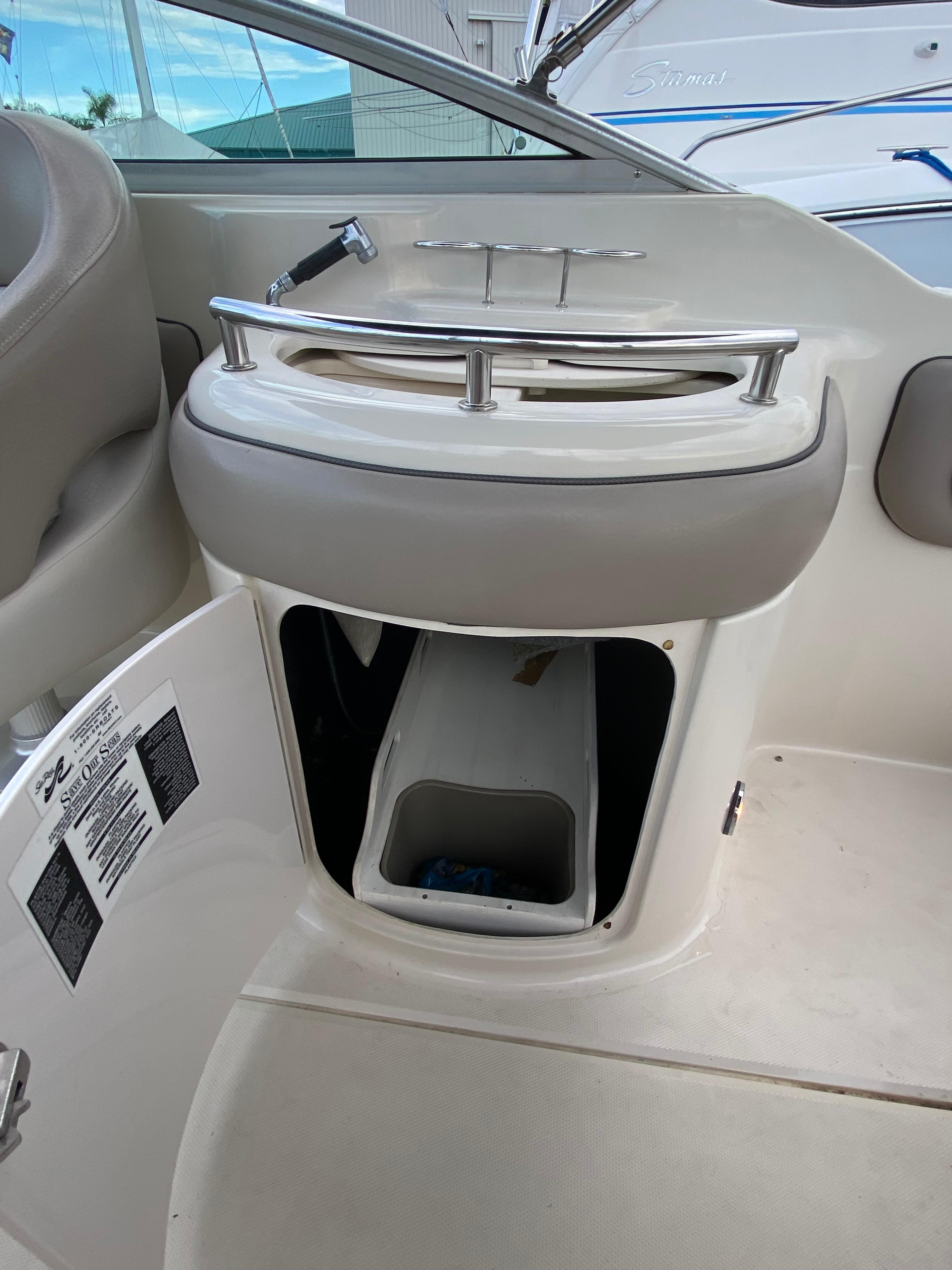 For entertaining she has a Bluetooth stereo, a double sink with fresh water and dedicated cooler storage and trash can. The bow area can be converted to an overall sun pad or there is a table that can go in the bow or stern for cocktails.