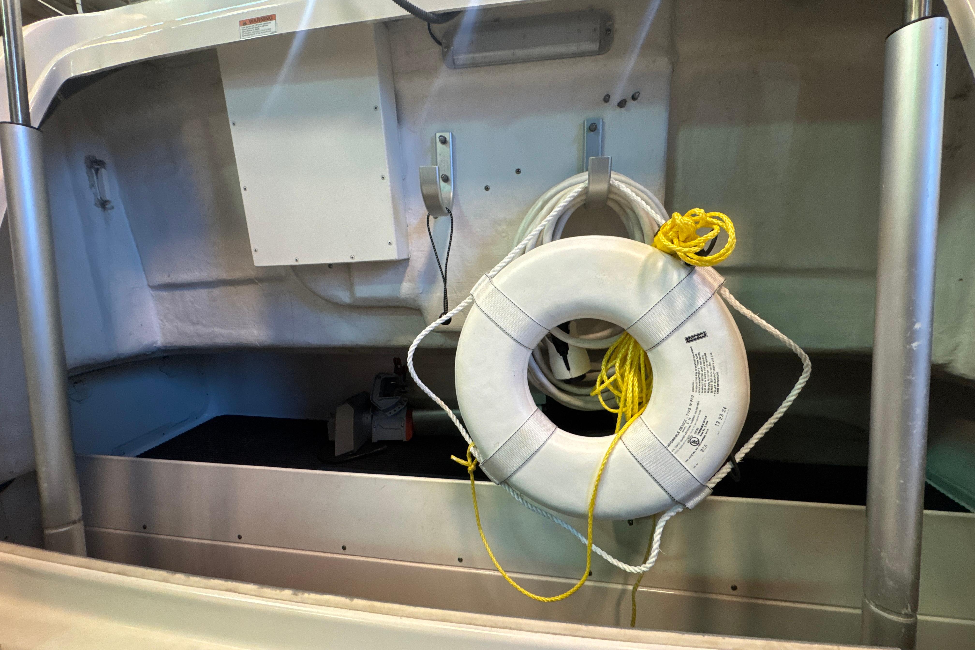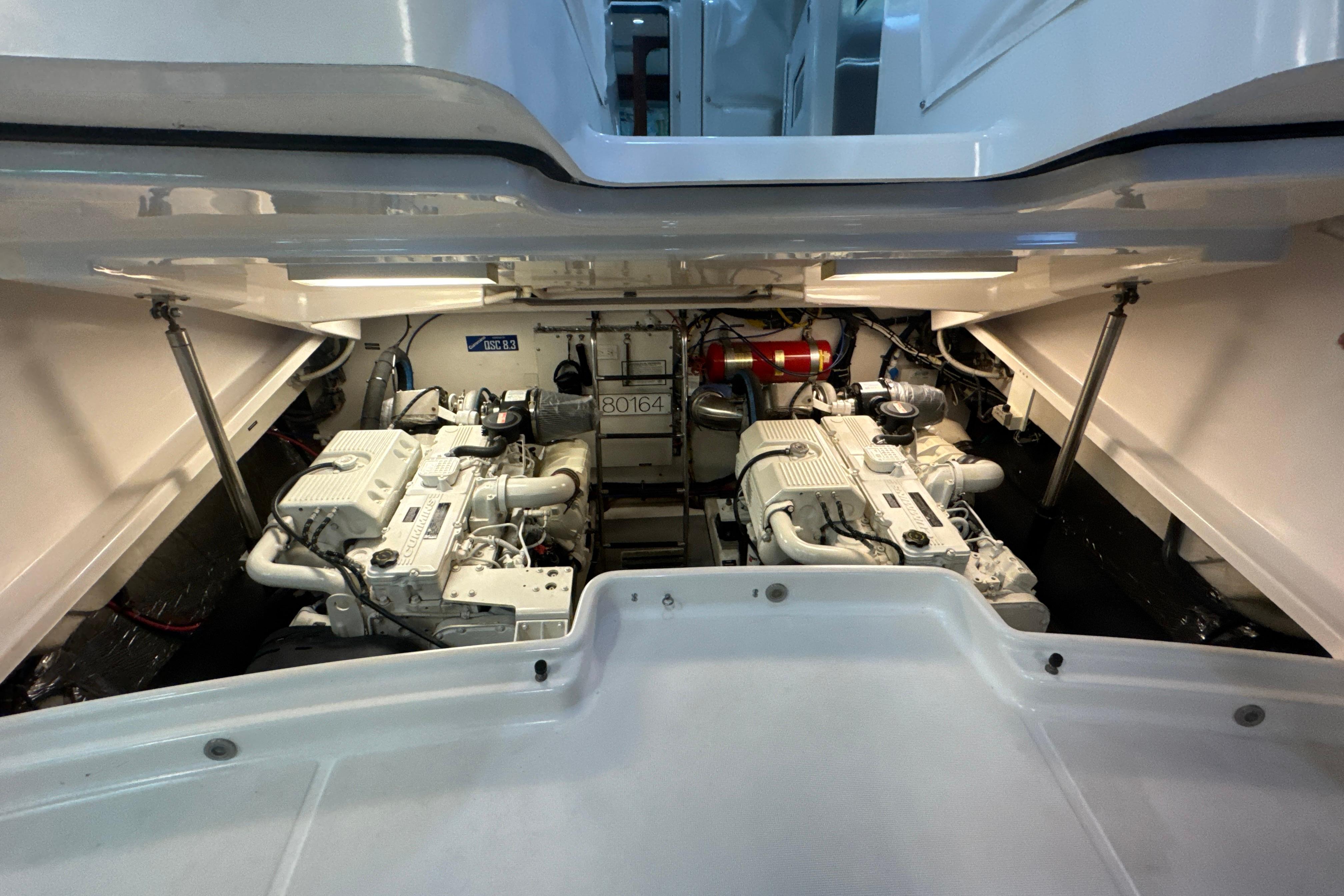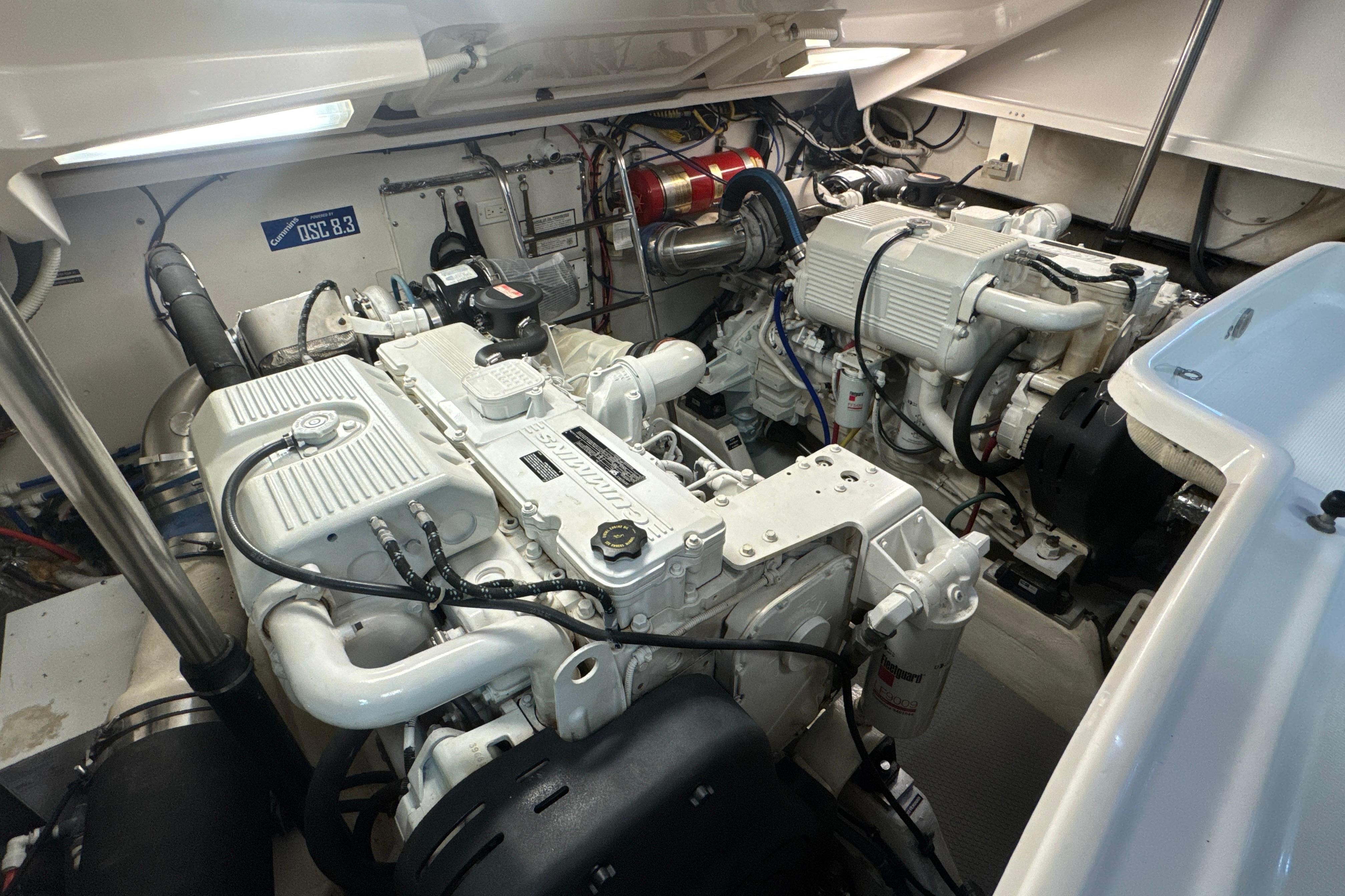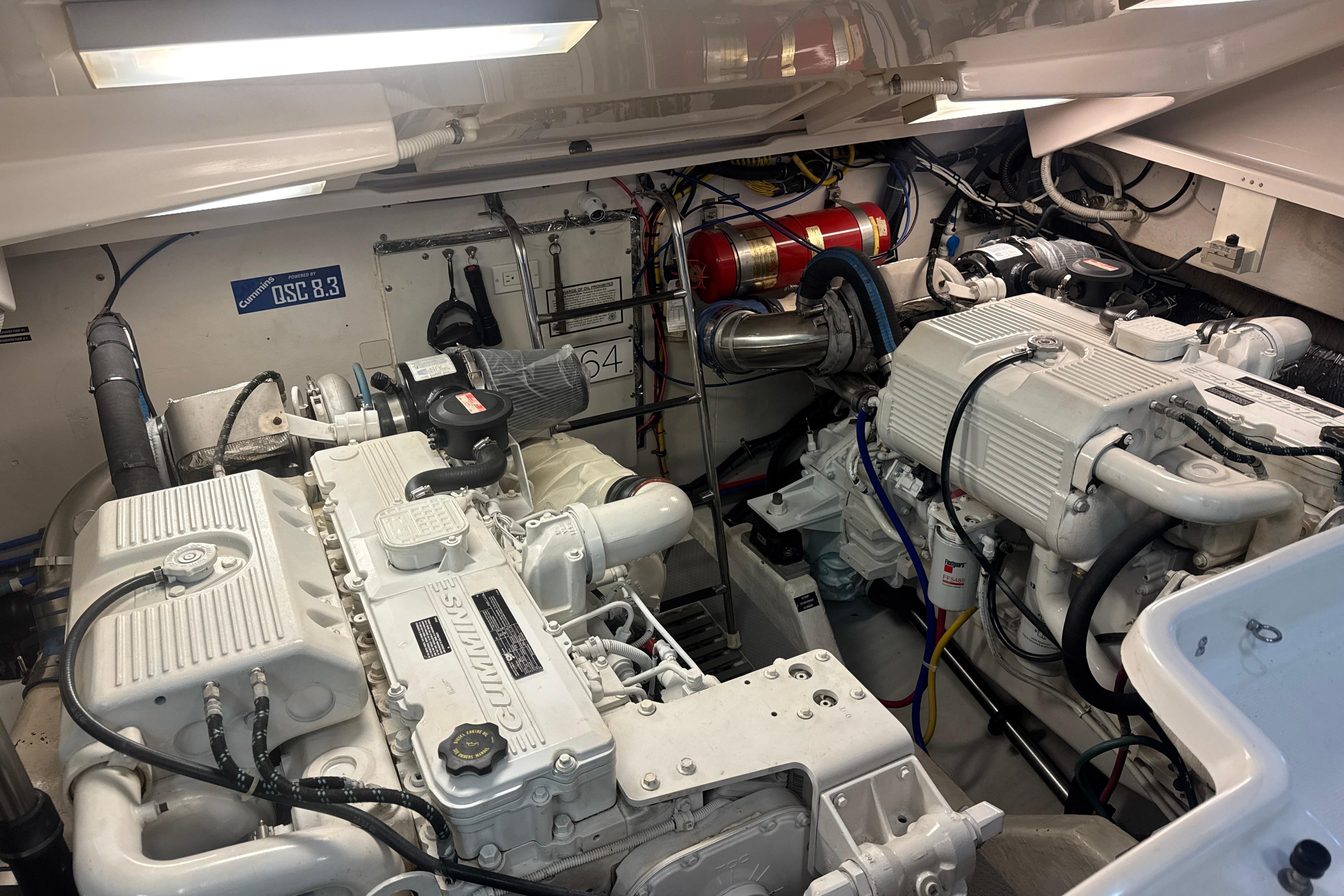 She is powered by twin 490 hp Cummins QSC 8.3 turbocharged engines. These electronically controlled, common-rail engines feature four valves per cylinder and are widely regarded as a strong and reliable power package for this model. The 490 QSCs are known for smooth, efficient operation and a clean, low-odor exhaust that exits underwater.