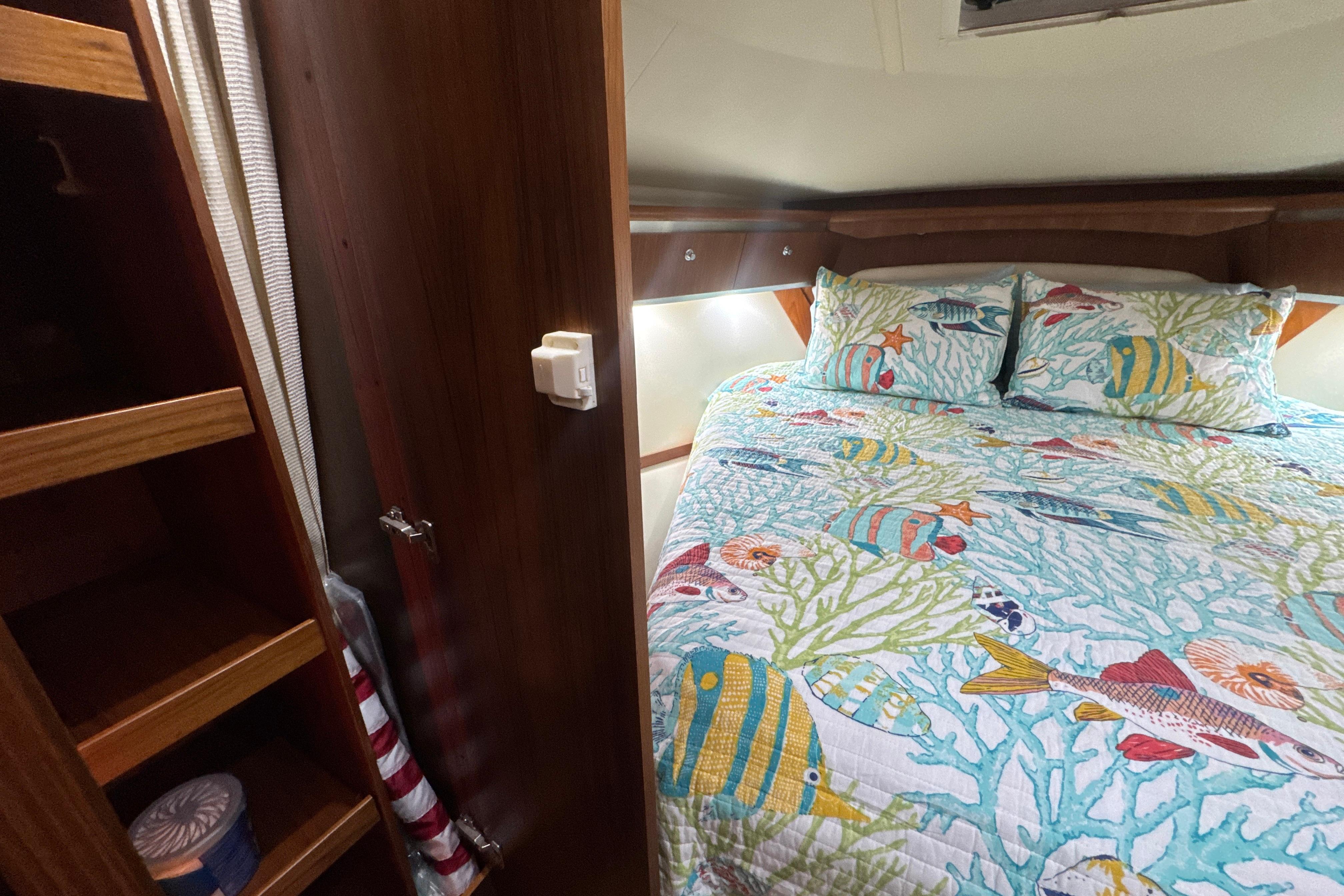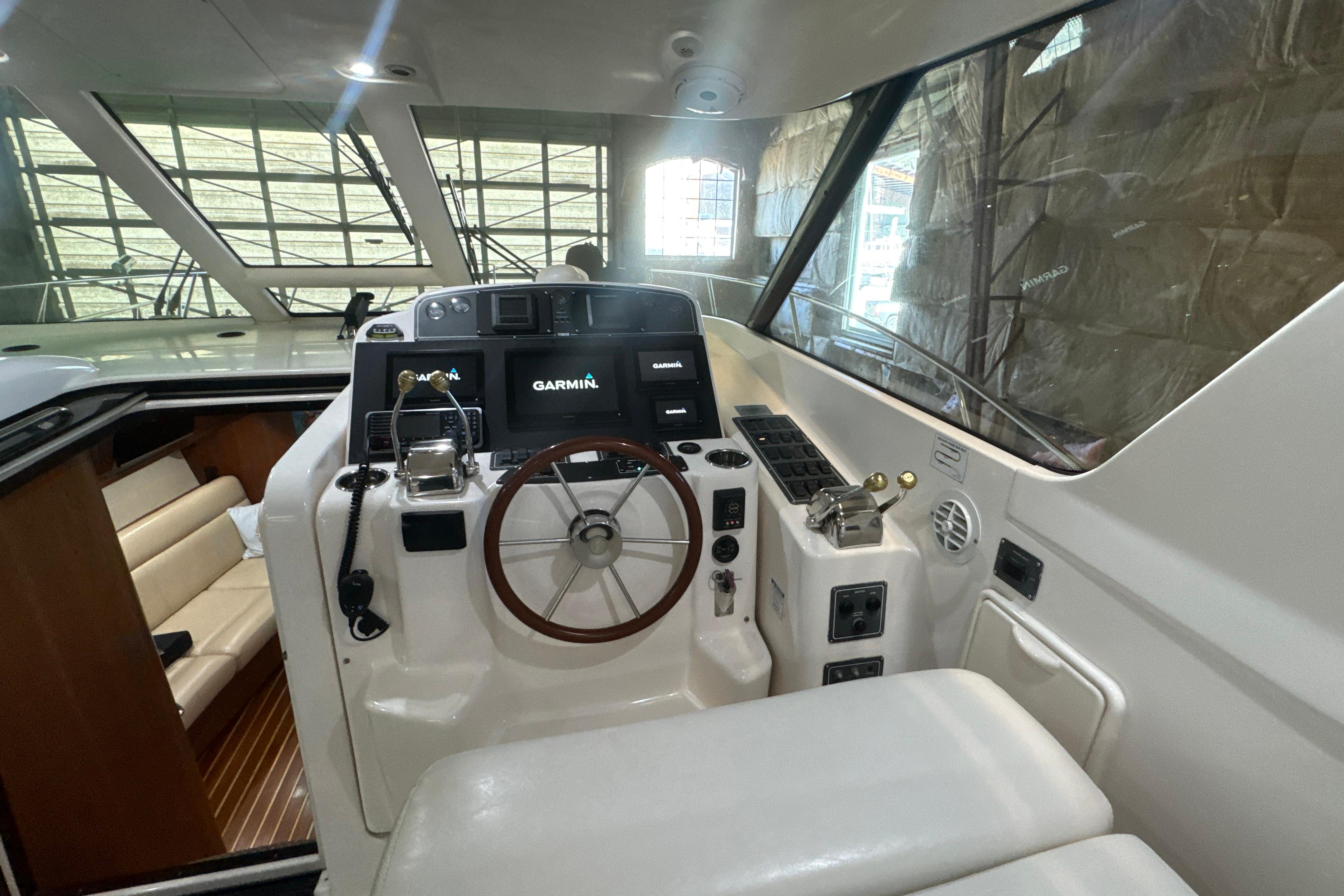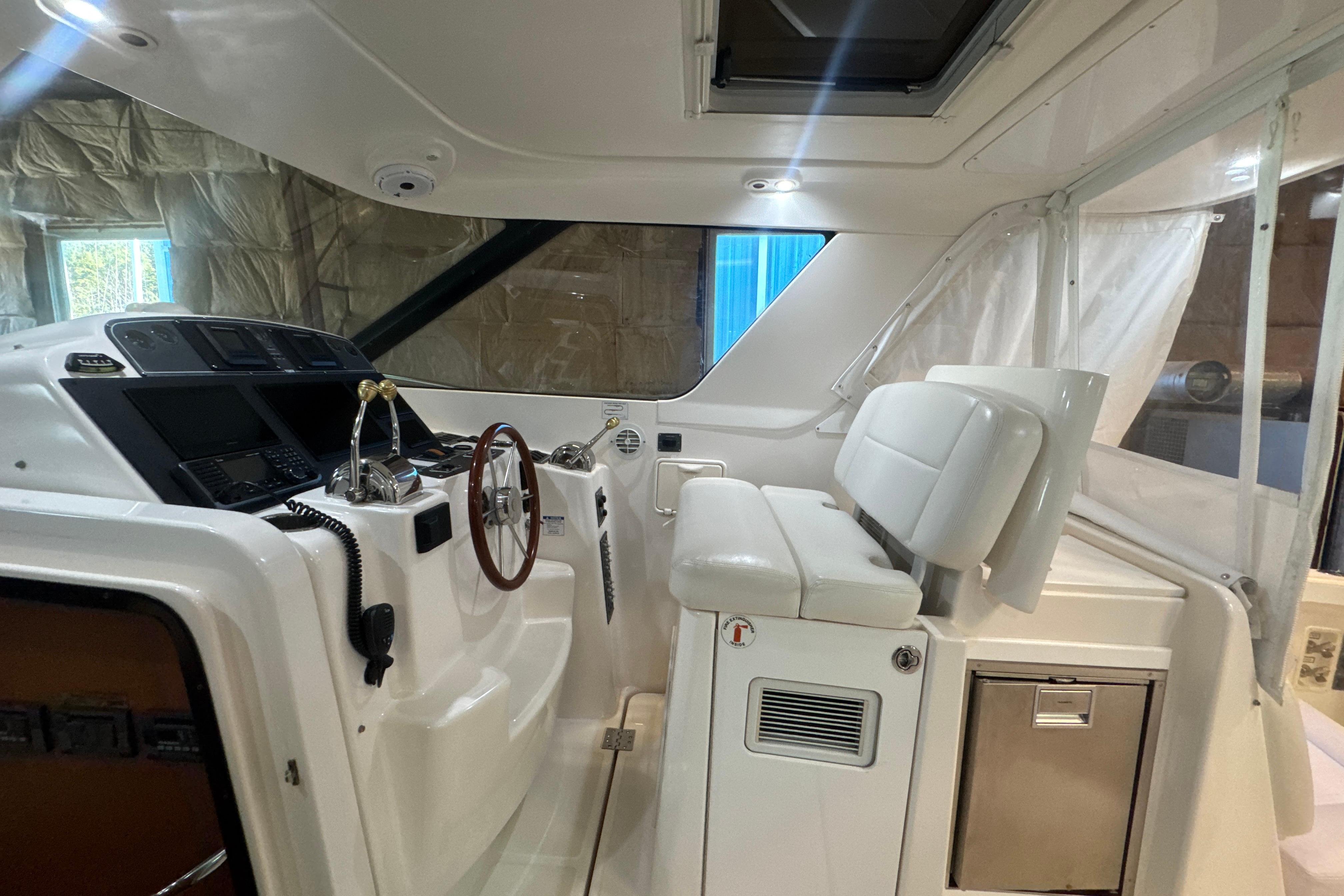 The Tiara Sovran 3600 brings with her everything that is Tiara Yachts including solid, dependable hull design, flawless gel coat finish, standard integrated composite windshield and hardtop, high-grade stainless steel hardware, and designed safety features that are built for the boater. With Tiara Yachts you know you'll have confidence in the quality and dependability that comes with decades of boat building experience. No more wrestling with canvas, the integrated composite windshield and hardtop design add unmatched cruising comfort and clear obstruction free views while sitting or standing. There is plenty of room for guests at the spacious companion L-lounge and the captain will sit comfortably at the custom adjustable helm seat. Below decks the Sovran 3600 displays the finest in custom cabinetry. The spacious interior provides plenty of elbowroom and all the comfort you need for those long weekends and extended trips. The forward master stateroom features a queen size pedestal berth with inner spring mattress, lots of storage and built-in flat panel television.