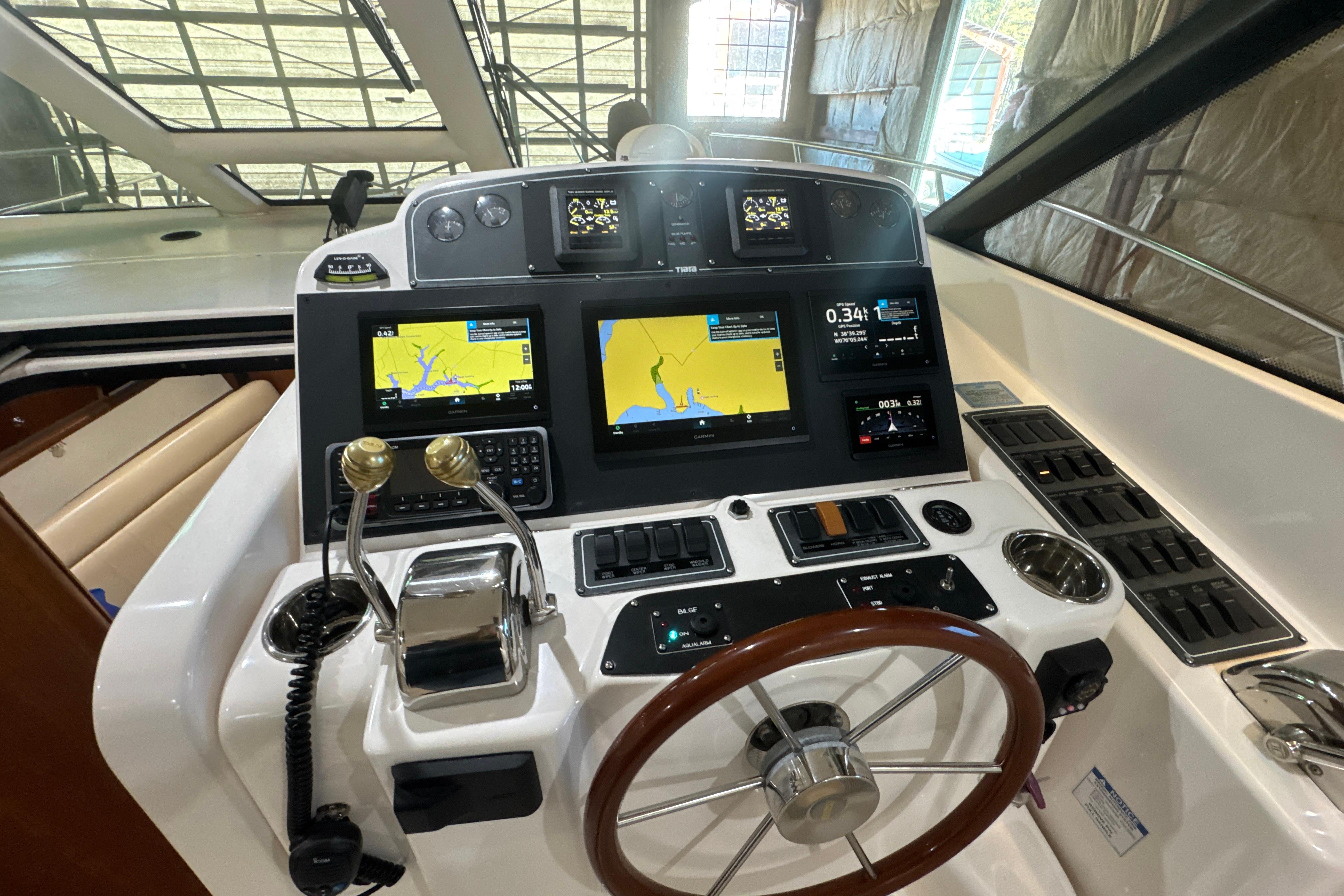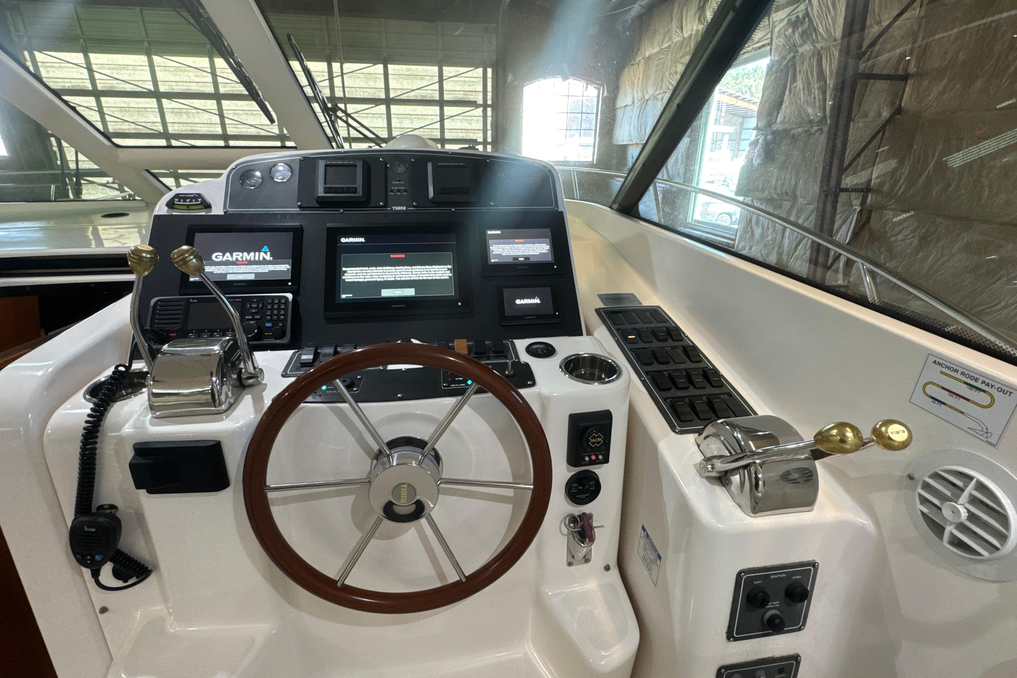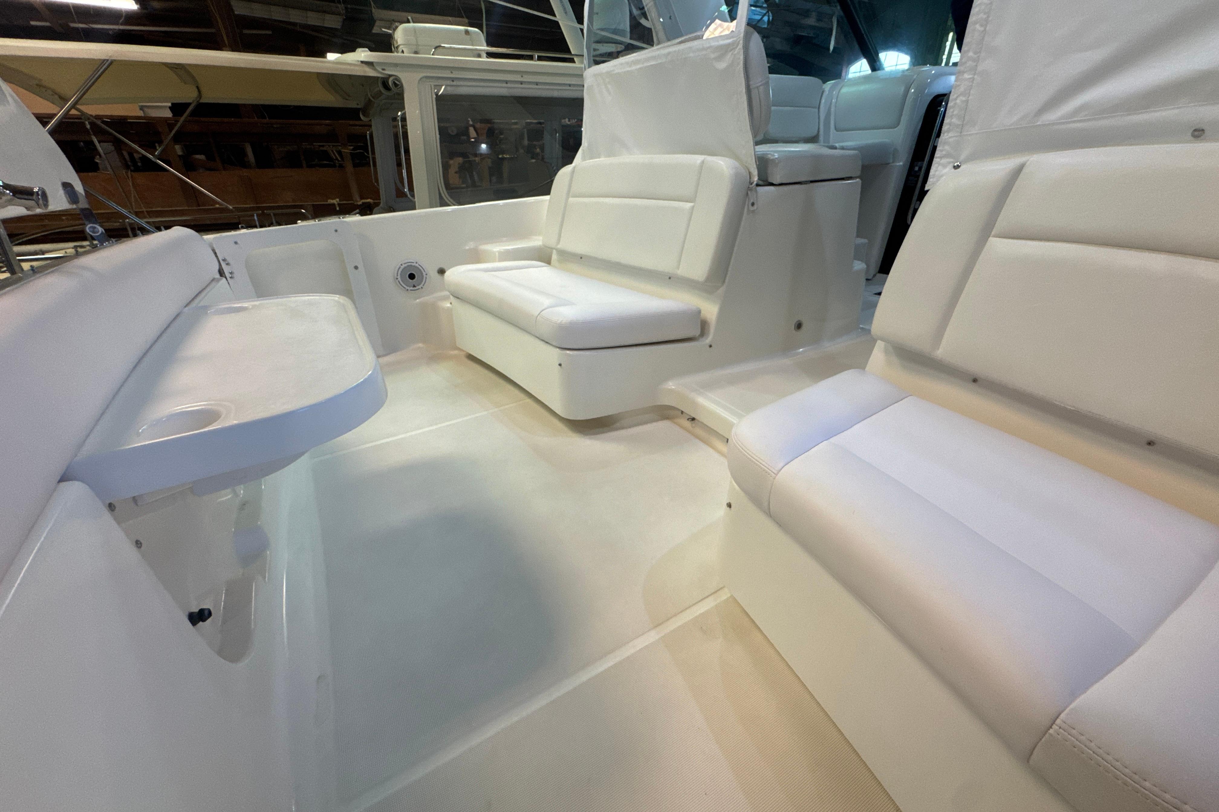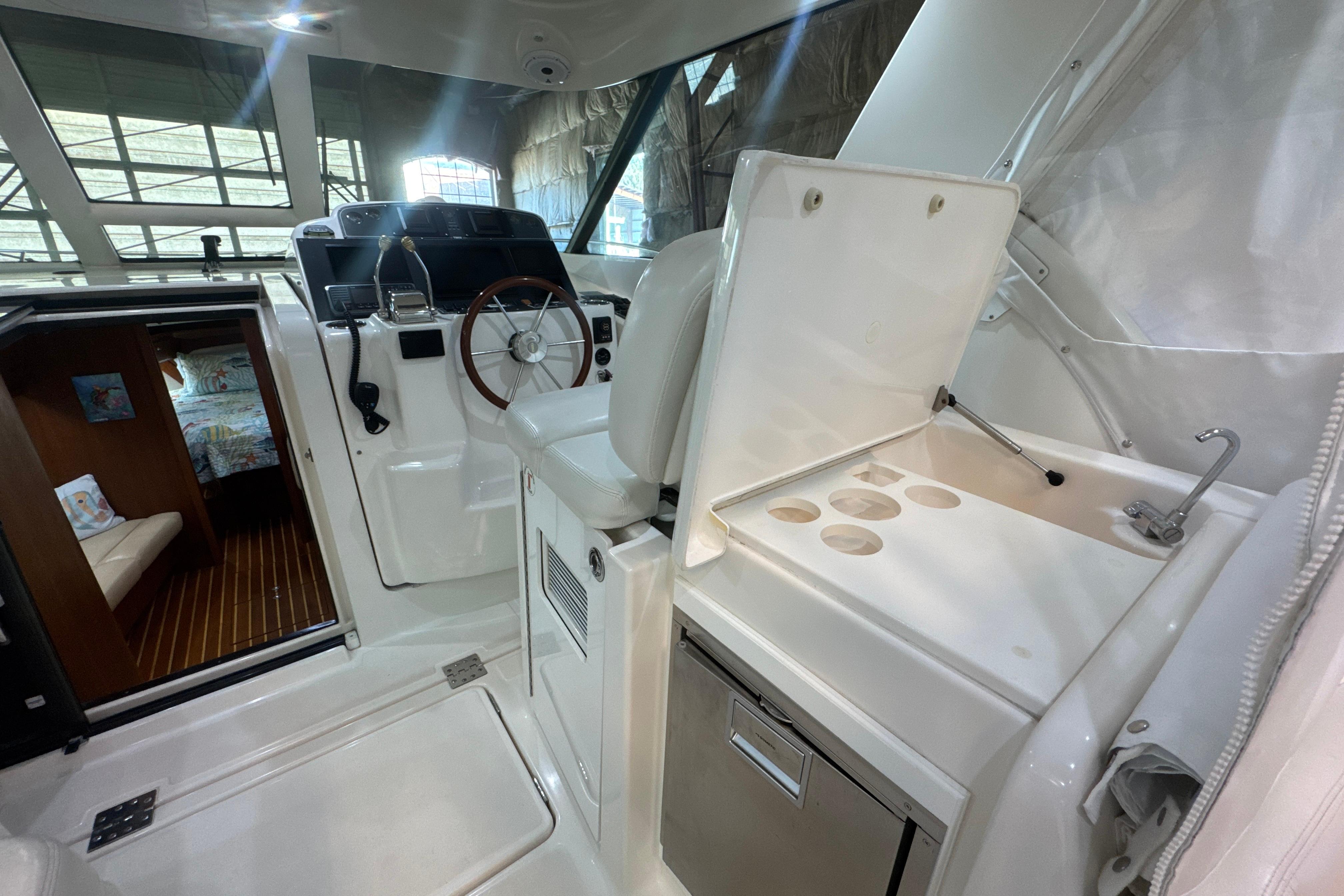 The Tiara Sovran 3600 brings with her everything that is Tiara Yachts including solid, dependable hull design, flawless gel coat finish, standard integrated composite windshield and hardtop, high-grade stainless steel hardware, and designed safety features that are built for the boater. With Tiara Yachts you know you'll have confidence in the quality and dependability that comes with decades of boat building experience. No more wrestling with canvas, the integrated composite windshield and hardtop design add unmatched cruising comfort and clear obstruction free views while sitting or standing. There is plenty of room for guests at the spacious companion L-lounge and the captain will sit comfortably at the custom adjustable helm seat. Below decks the Sovran 3600 displays the finest in custom cabinetry. The spacious interior provides plenty of elbowroom and all the comfort you need for those long weekends and extended trips. The forward master stateroom features a queen size pedestal berth with inner spring mattress, lots of storage and built-in flat panel television.