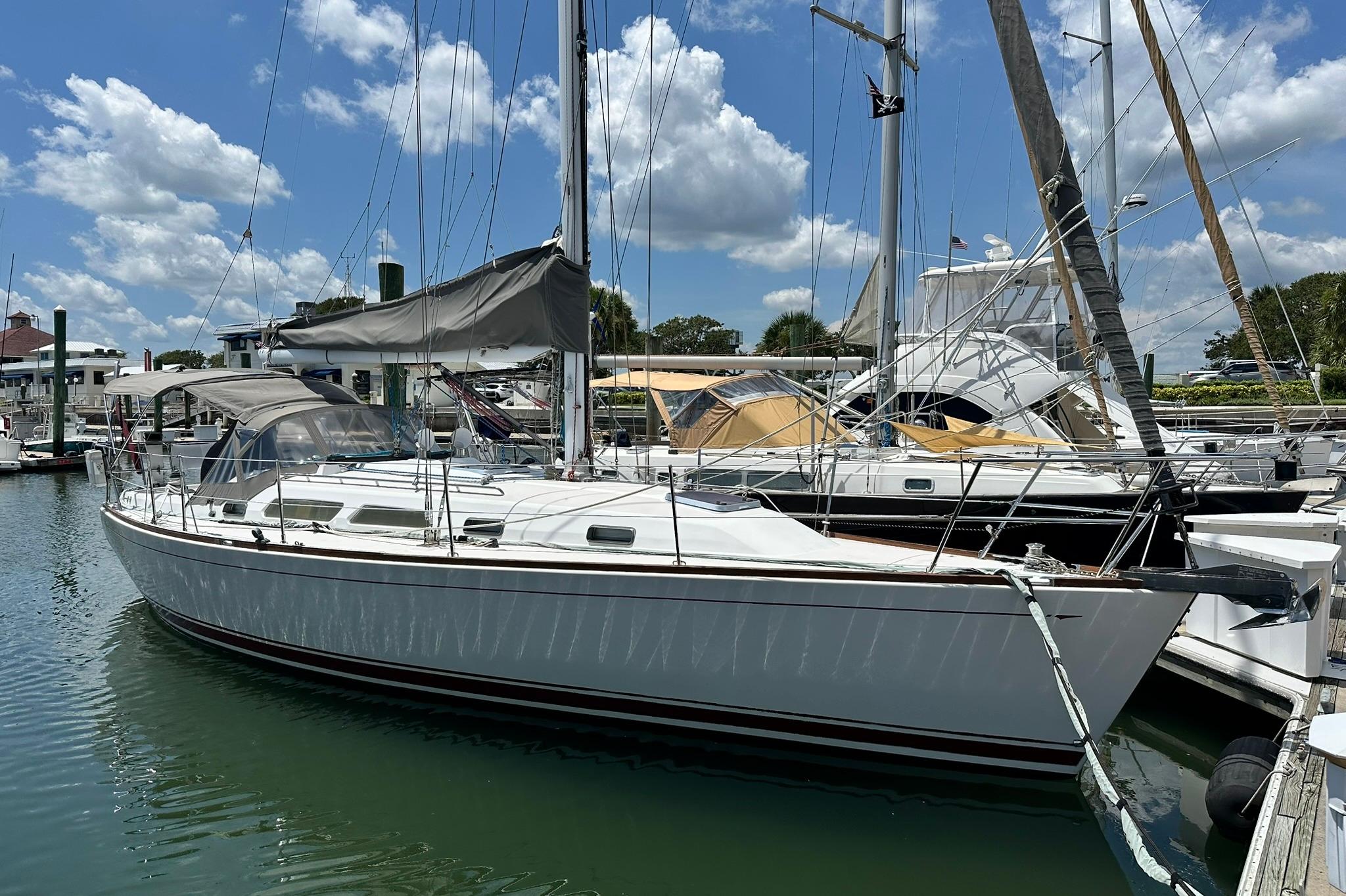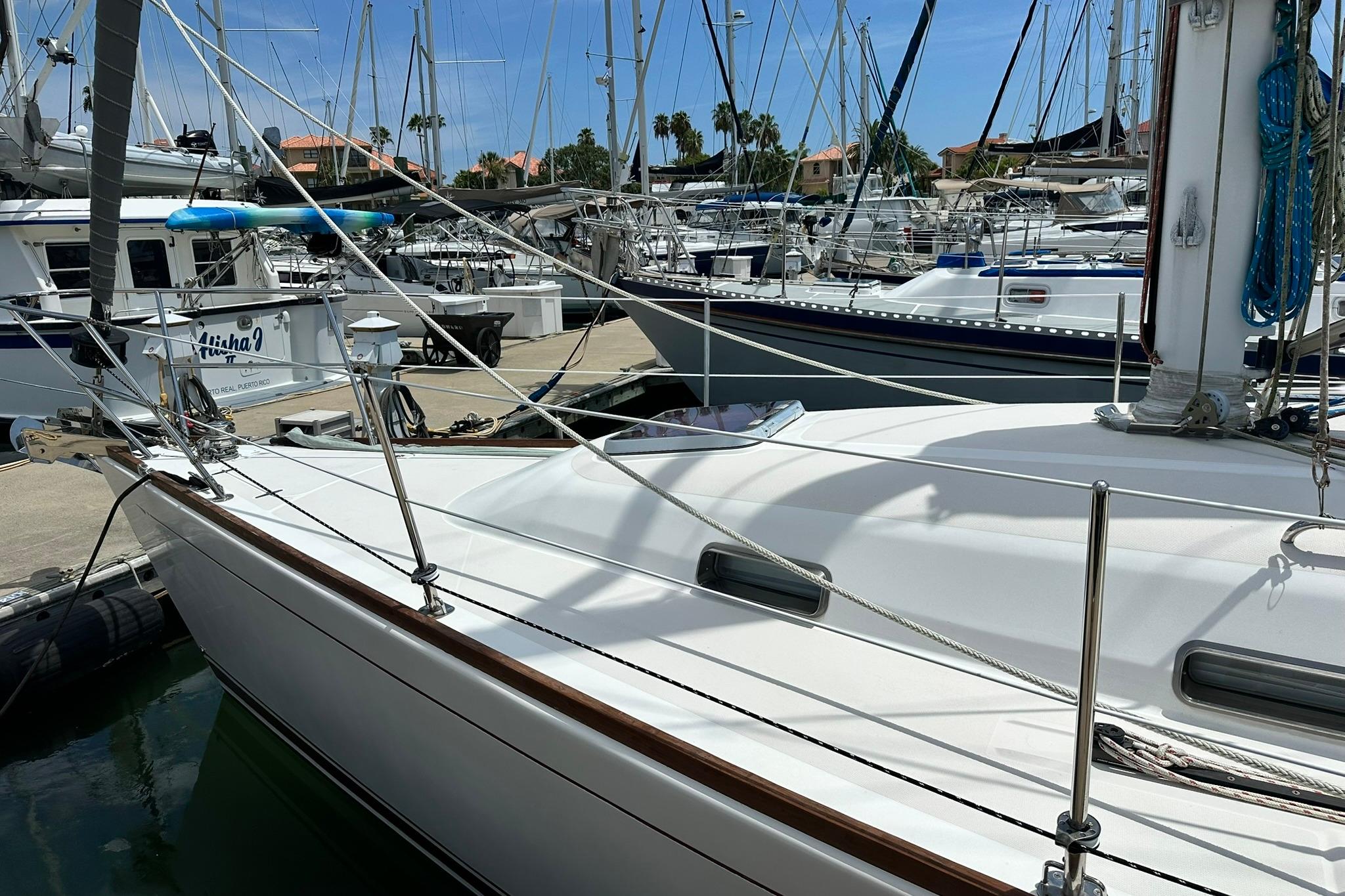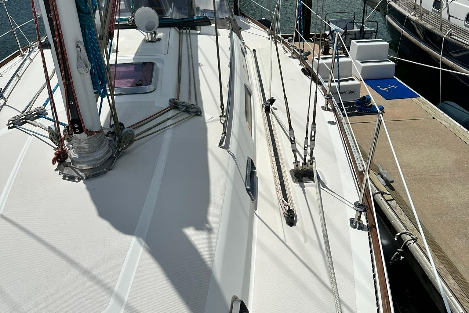 Her sleek lines and clear decks are an invitation to board this lovely lady and cast of the lines. Her simple sail plan and ease of traveling the decks make her a pleasure to sail. She has all sail controls led back to the cockpit and are assisted with a powered winch on the cabin top. The headsail is roller furling and her mainsail is stowed in a lazy back. Her bow has two rollers for a primary and secondary anchor set up.