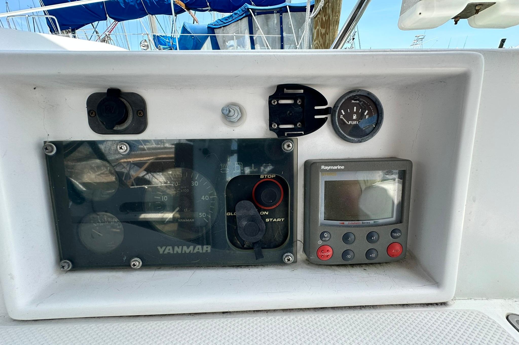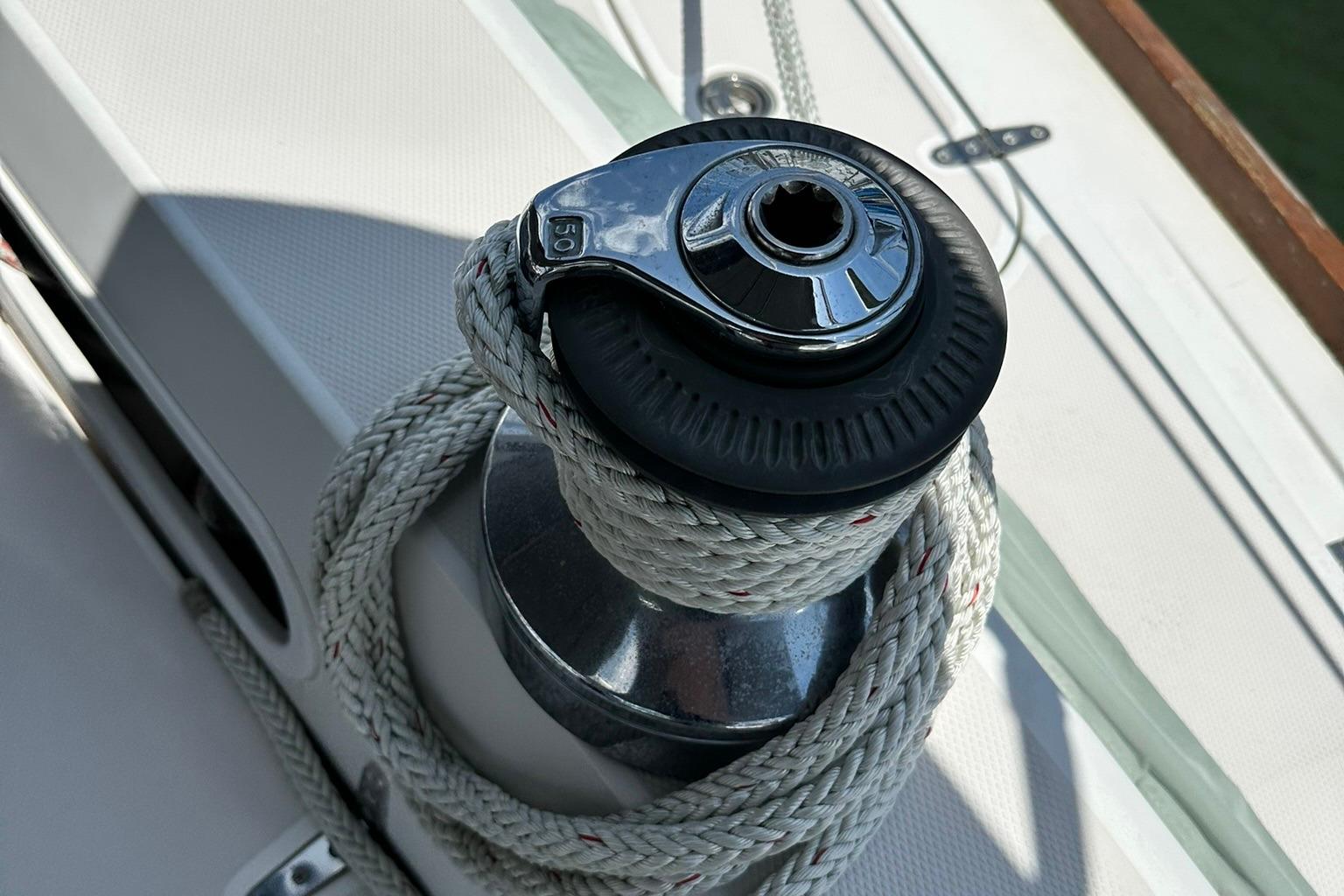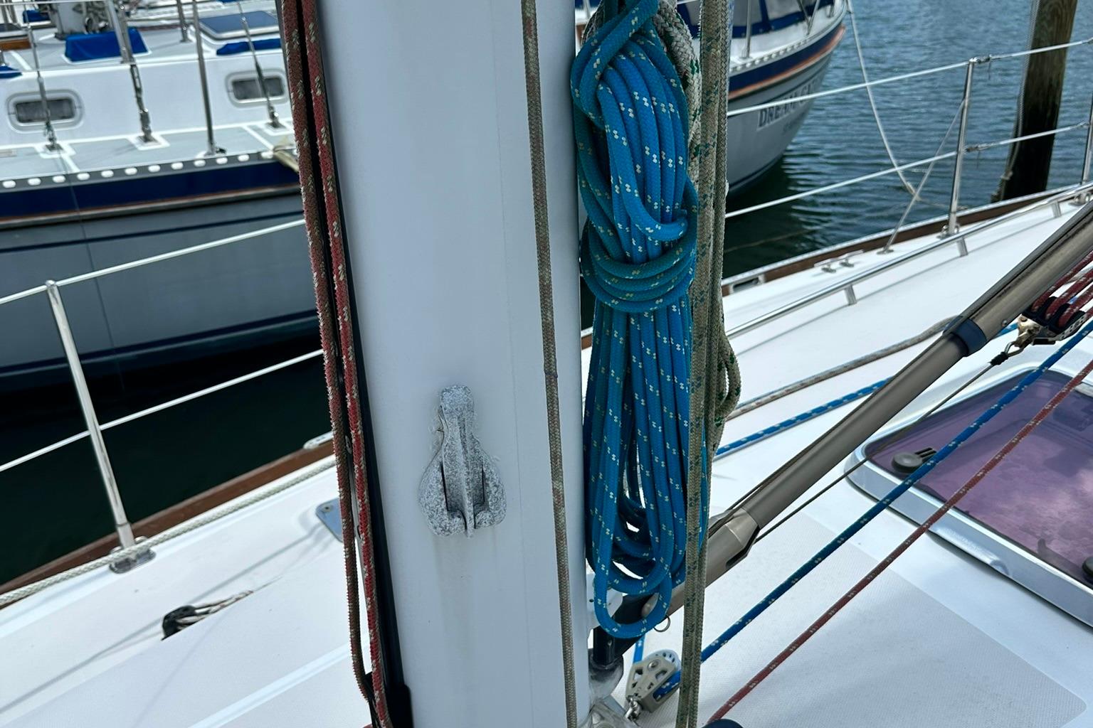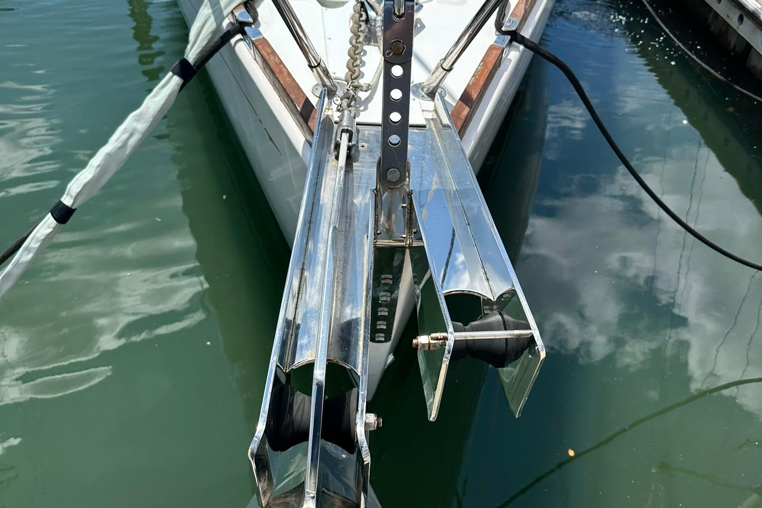 Her sleek lines and clear decks are an invitation to board this lovely lady and cast of the lines. Her simple sail plan and ease of traveling the decks make her a pleasure to sail. She has all sail controls led back to the cockpit and are assisted with a powered winch on the cabin top. The headsail is roller furling and her mainsail is stowed in a lazy back. Her bow has two rollers for a primary and secondary anchor set up.