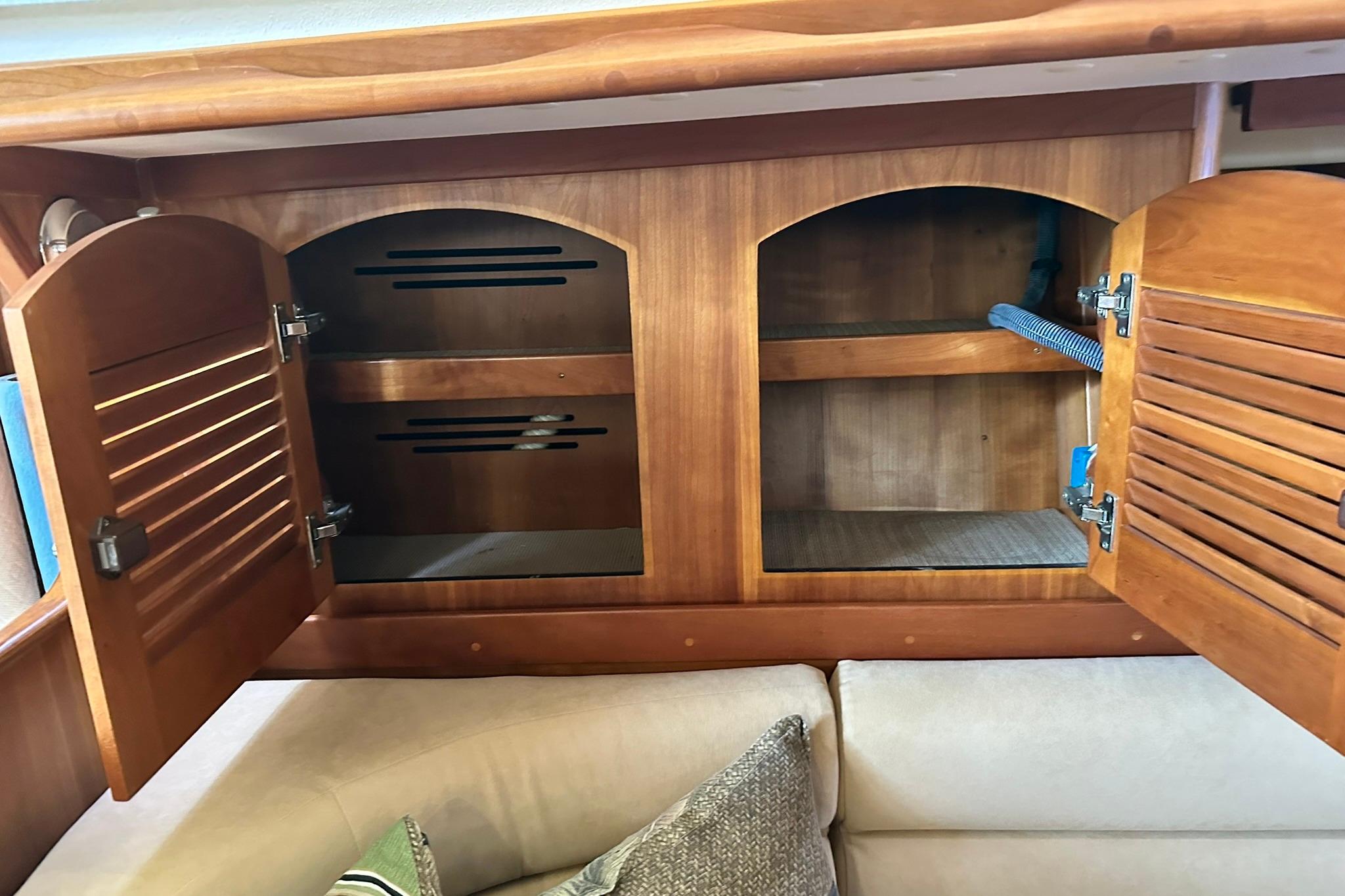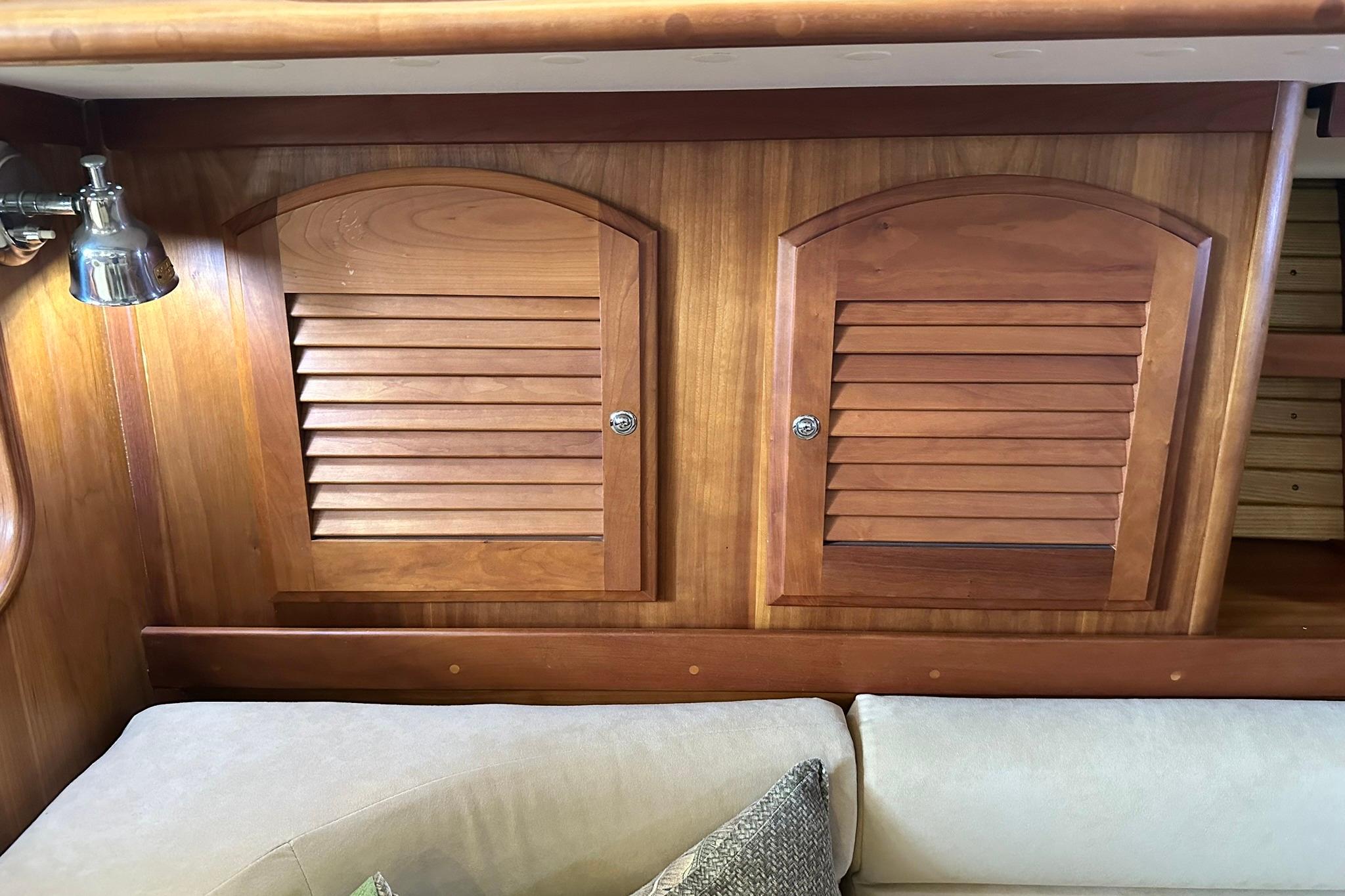 Opposite the galley is the navigation station with instruments and a table for equipment. Forward is the main salon with a large teak and holly inlaid folding table that can fold up out of the way for a large room feel. Both starboard and port have comfortable settees with storage under and outboard.