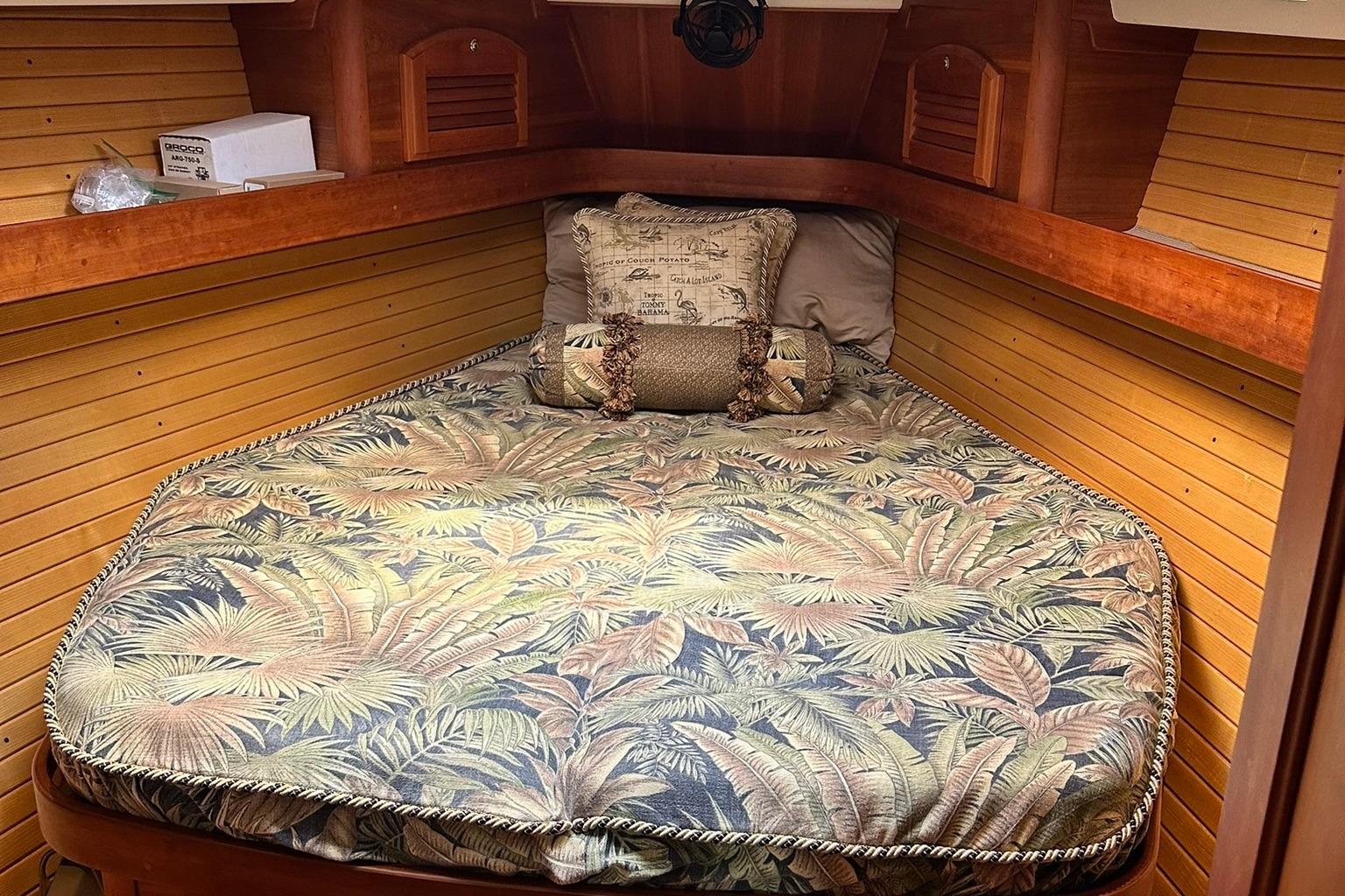 The primary berth is in the bow with an island style berth, upper storage cabinets, a hanging locker and sink with large mirror for convenience.