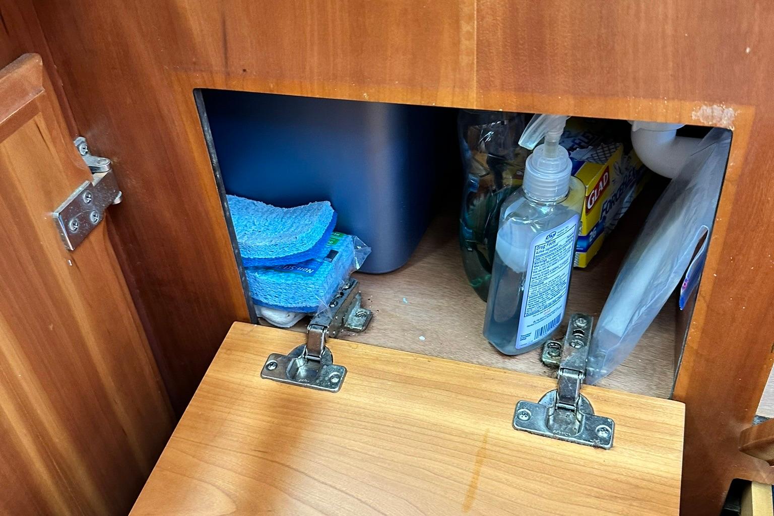 Forward on port is the galley with Force 10 3 burner stove with oven. The fridge has loading and front loading access. There is a deep double stainless steel sink with fresh water from the water pump and fresh and salt from foot pumps as well.