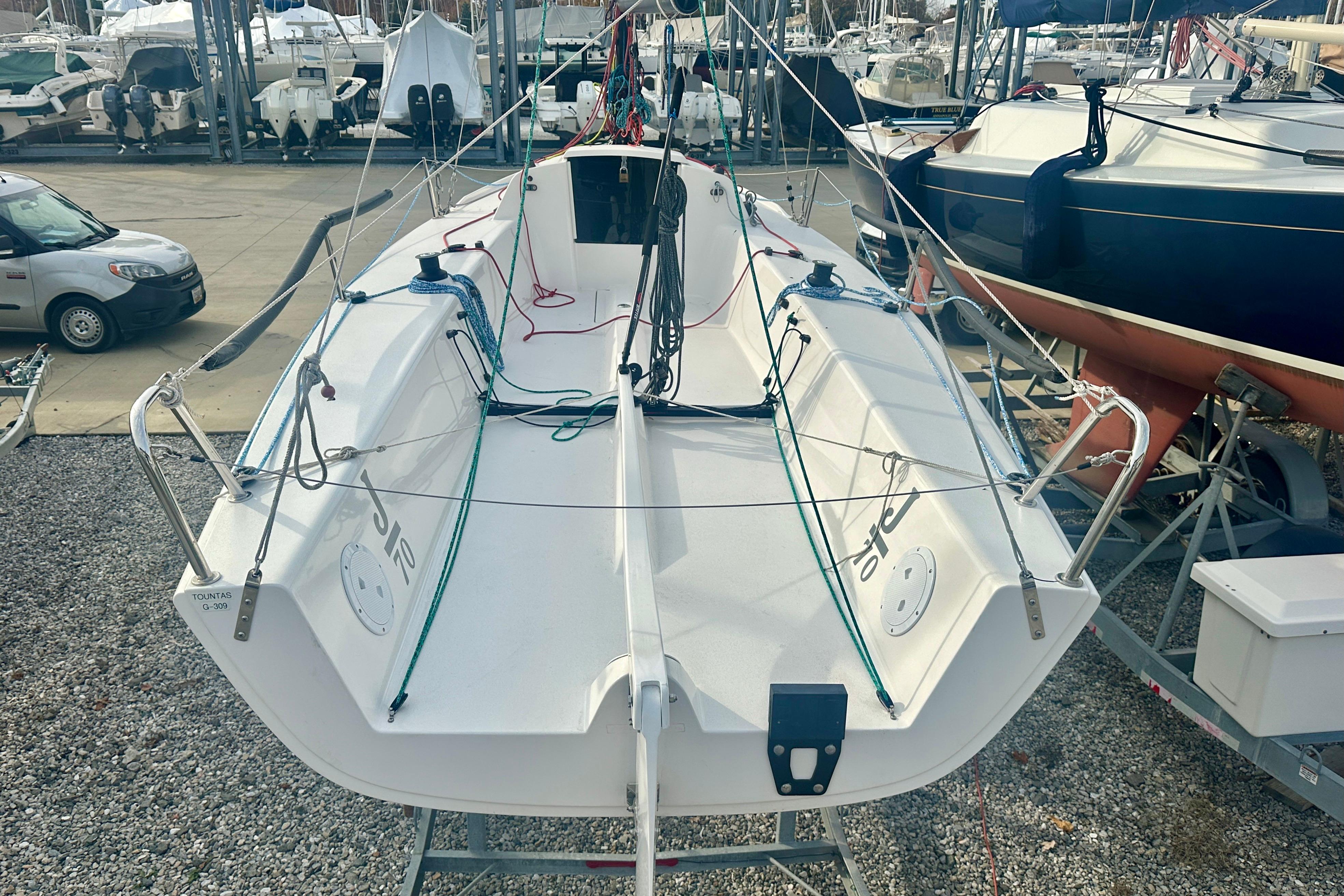 This J/70 is well maintained and cared for. It has been used as a daysailer, never been raced, by its current and only owners in light winds (less than 15 kts), approximately half a dozen times per year. The deck, hull, keel, and rudder are like new, and there's no damage or scratches to the gel coat; the boat has never been in an accident. It is always kept under a full-deck, over-the-boom cover when not sailing. The mainsail and jib are in very good condition and are stored rolled, not folded; the spinnaker has barely been used and is in excellent, race-ready condition. The boat is kept in the marina dry-docked on its trailer, and has never been hauled on local roads or highways. This boat is ready to go, in need of nothing to get on the water immediately, either racing or daysailing. Moreover, there is a long list of additional equipment that adds to the readiness of this boat to set sail. Come take a look today!