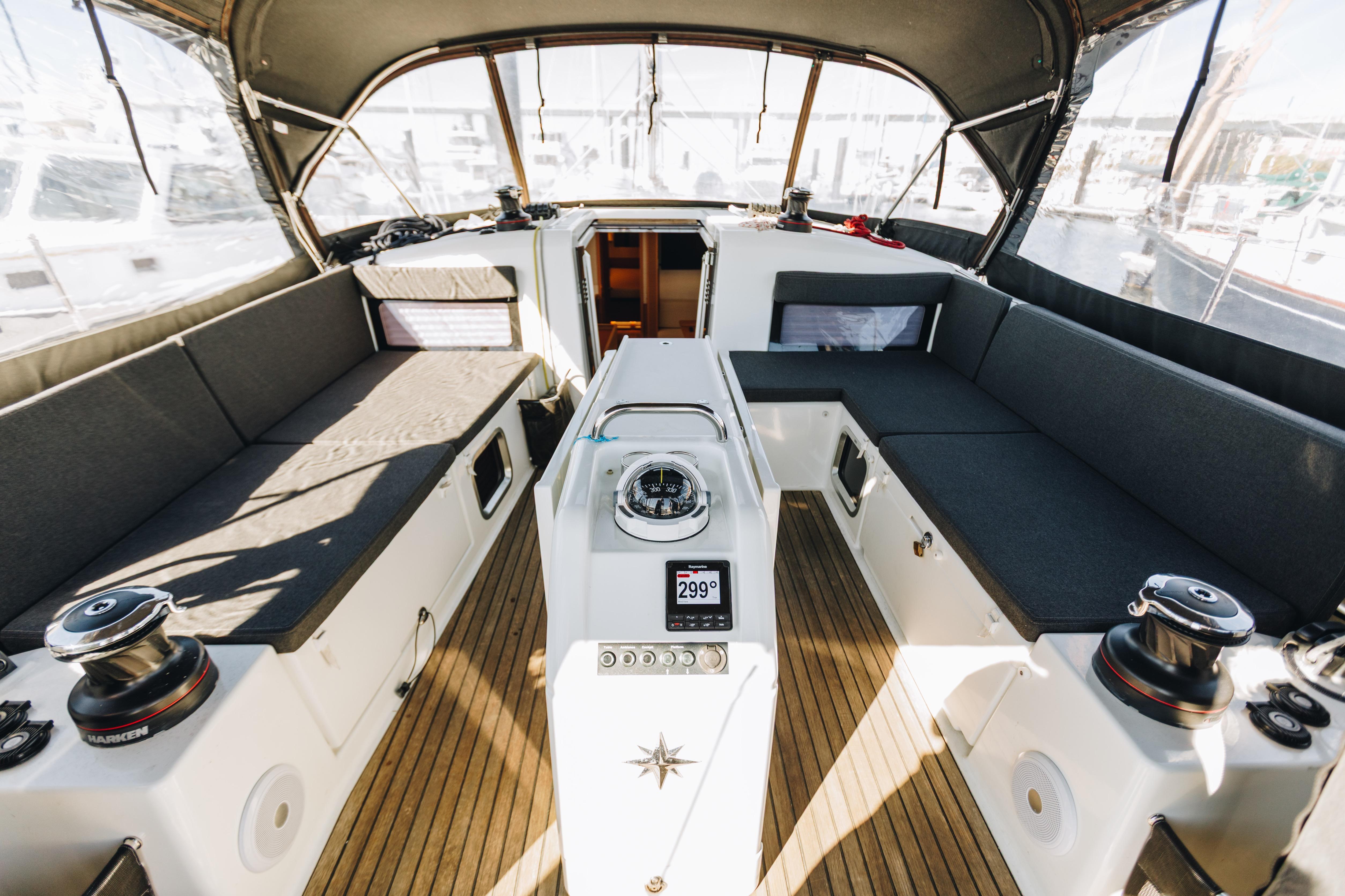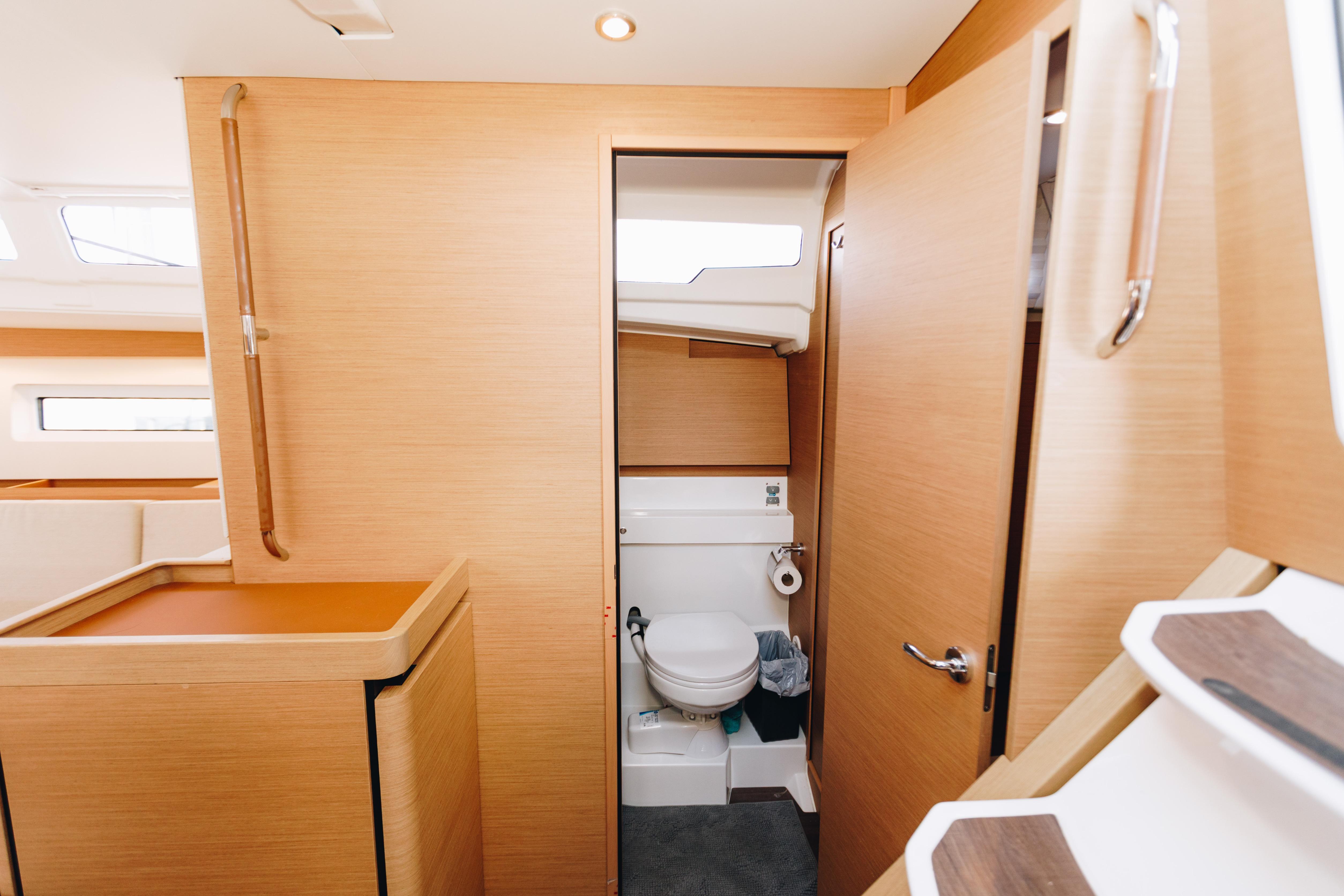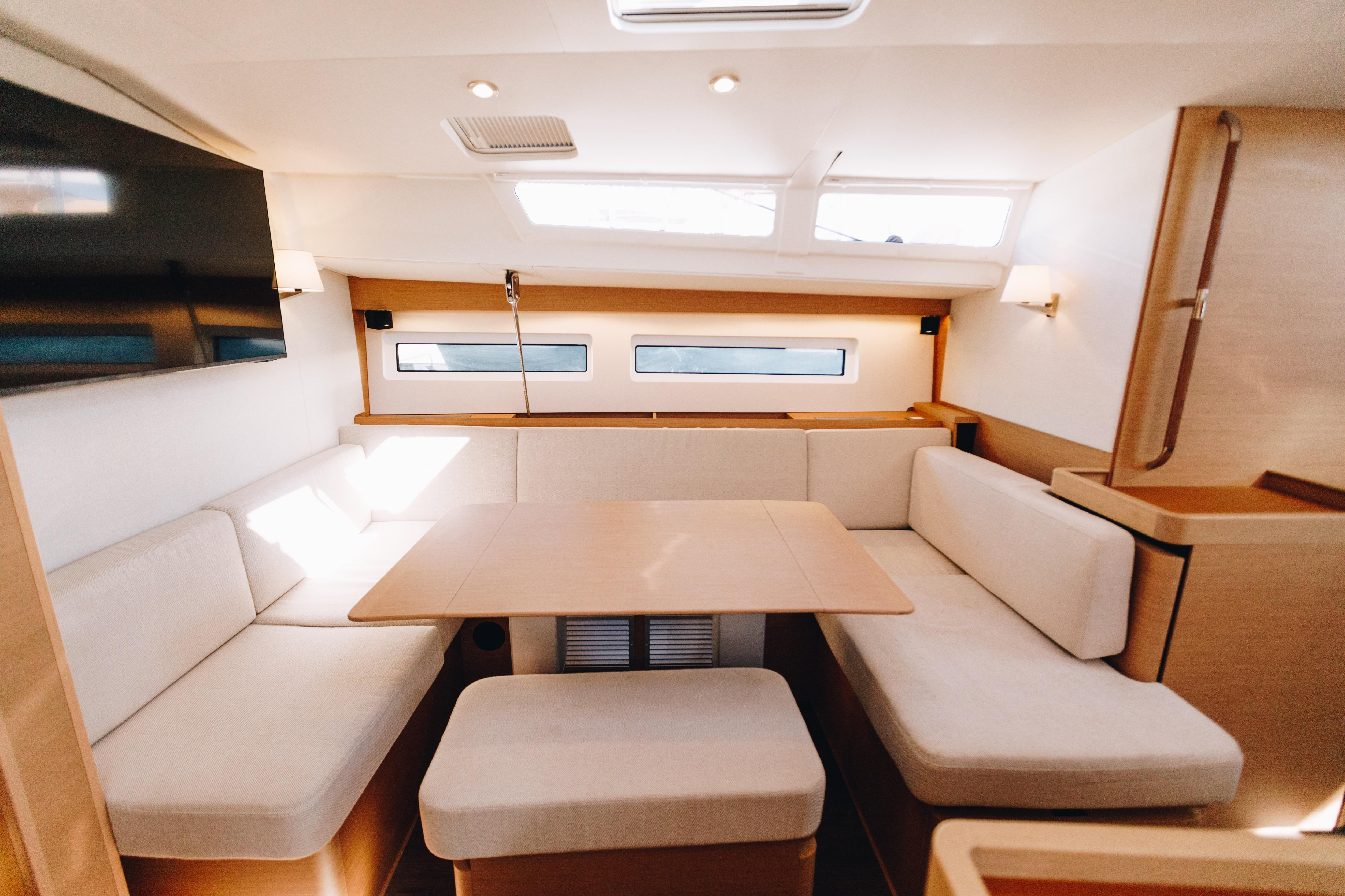 As with every Sun Odyssey, the cockpit ergonomics are second to none. Every sheet is cleverly led to the helm station, where the boat can be easily single or double handed. The massive cockpit lounge is framed by the iconic walk around decks, which make movement around the boat easier than ever before. However, the game changer comes when the convertible coamings, the unfolding seat backs, are set up as beds. The entire aft eight feet of the boat transform into a cushioned sun bathing deck.