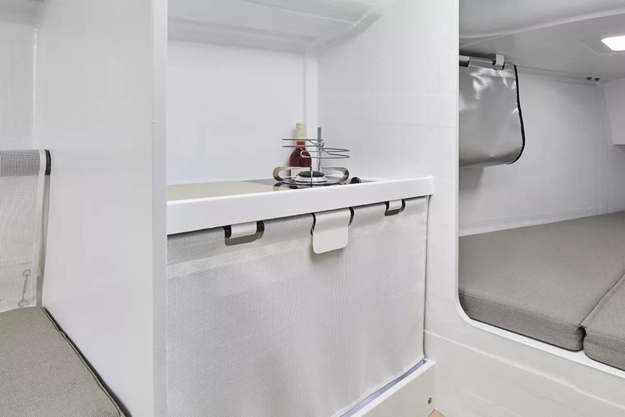 A reliable 15 HP inboard engine coupled with simple linear shaft drive and foldable propeller guarantees high cruising speeds, ease of use and low maintenance.